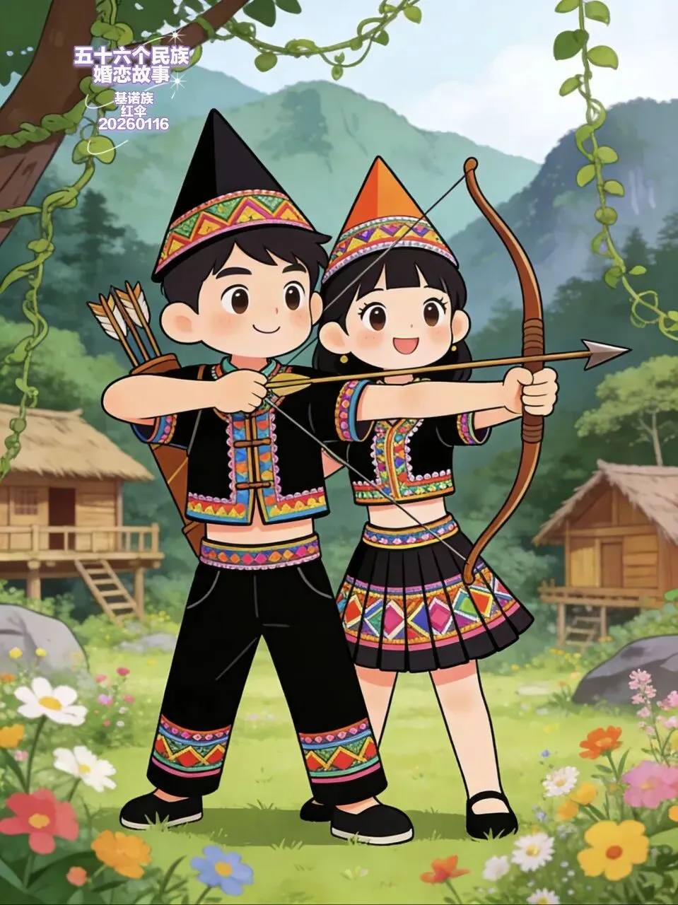 当第一缕晨曦再次漫过茶树时,阿木和阿妹背着竹篓站在山巅。牛角弓与采茶篓并立在晨光里,就像他们此刻并肩的身影。阿木的箭囊上,茶花纹与几何彩纹交织成密语;阿妹的围裙上,太阳花图案正随着她的动作轻轻摇晃。