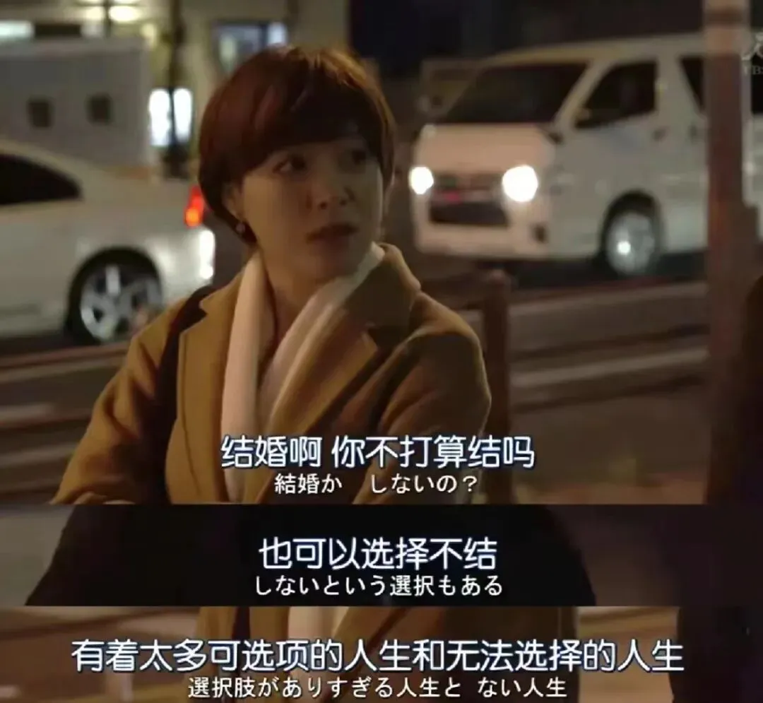 《春夜》剧照安和海薇绝不是不婚主义者、或者恐婚群体。我和她们聊过为什么恋爱这么久却不结婚?她们的回答很相似,自己也曾在某个时刻有过想要和另一半结婚的念头,虽然很短暂,但就和“正常人”一样,觉得自己应该在一个合适的时间、和身边这个适合的人结婚、成家、养育下一代,算是给自己的人生有个交代。但很奇怪,要么是时机不对、要么是错过了。总之过了那个moment,好像就再也没有要往婚姻大门冲刺的想法了。我想这也许是当今除了恐婚而选择不婚的另外一种原因:那些与婚姻失之交臂的人,不是因为“恐”,而是因为“没必要”——对恋爱不排斥、不恐惧,甚至渴望与他人发展一段深刻的关系,但是没必要以婚姻作为一段关系的句点。在Opting Out: Women Messing with Marriage around the World一书中,作者通过研究发现,即使很多国家的女性生活在一个把结婚视作“体面性”的“符号和守护者”的范式里,现在也有越来越多的女性选择不结婚。主要原因包括婚姻关系里不忠带来的伤害、女性职业机会和独立性的增加、以及与父母和兄弟姐妹一起生活时的更多安全感。书中写道:“婚姻在历史上和世界各地大多数情况下对女性来说并不是一个好的选择,随着女性有了更多成为完整个体的机会,她们试图找到替代解决方案。”比如,女性通过友谊、亲情家庭或者同居生活找到情感支持。也许这些“解决方案”都会有让自己的情感感到孤独、沮丧的时候,但很多女性在决定不结婚这件事上,依然坚定不移。结婚与否是非常主观性、私密性的选择,从将婚姻视作“必修课”到认为婚姻“不再是自己人生路上的必要选择”,这种想法的改变与一个人的年龄、经历、实力有很大关系。年轻的时候,我们也许是出于对“有情人终成眷属”的浪漫执念、也许是出于“结婚是人生的必修课”这个传统习俗的遵从、也许是被周围进入婚姻的人“裹挟”,总之,结婚是当时人生里的一道必选题。但经历了一些世事,幸运地找到了对的人相恋与陪伴后,我们会对爱情的定义产生变化。尤其是当你像安和海薇一样,发现两个人维持现状是很好的状态时,不结婚也是一个理性又浪漫的选择。如果人生是一份答卷,婚姻不必成为我们的必选题,但也没必要让“结婚”成为我们害怕的“大分题”(它们通常出现在考卷的最后、分值最高、但也是最难的题目)。前两天我看到一条热搜:结婚的前提是什么?很多网友给出了自己的答案:比如这段婚姻能为自己提供某种价值(经济的、成长的、情绪的);或者将婚姻视作未来人生路上抵御风险的一种方案;亦或不想为可预见的传统带来的压力做无畏的抗争等等。当我们考量要不要结婚时,总是习惯从未来的角度去评估——是不是符合传统、能不能为自己带来利益——这些都无可厚非。但如果这种评估方式依旧让你对是否踏入婚姻大门举棋不定时,我们不妨可以换个角度,从当下自己的状态、心理和感受出发,用“活在当下”的思路去消解一下未来漫长婚姻里可能出现的得与失、利与弊。在悬而未决、没人知道结局走向的未来,至少现在的我们能够享受当下这份真挚爱情、这段美好的关系带来的快乐与舒适。