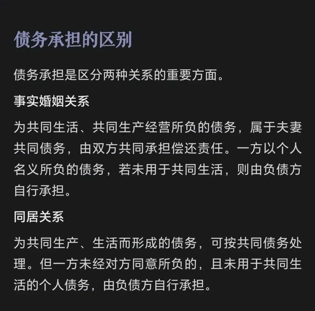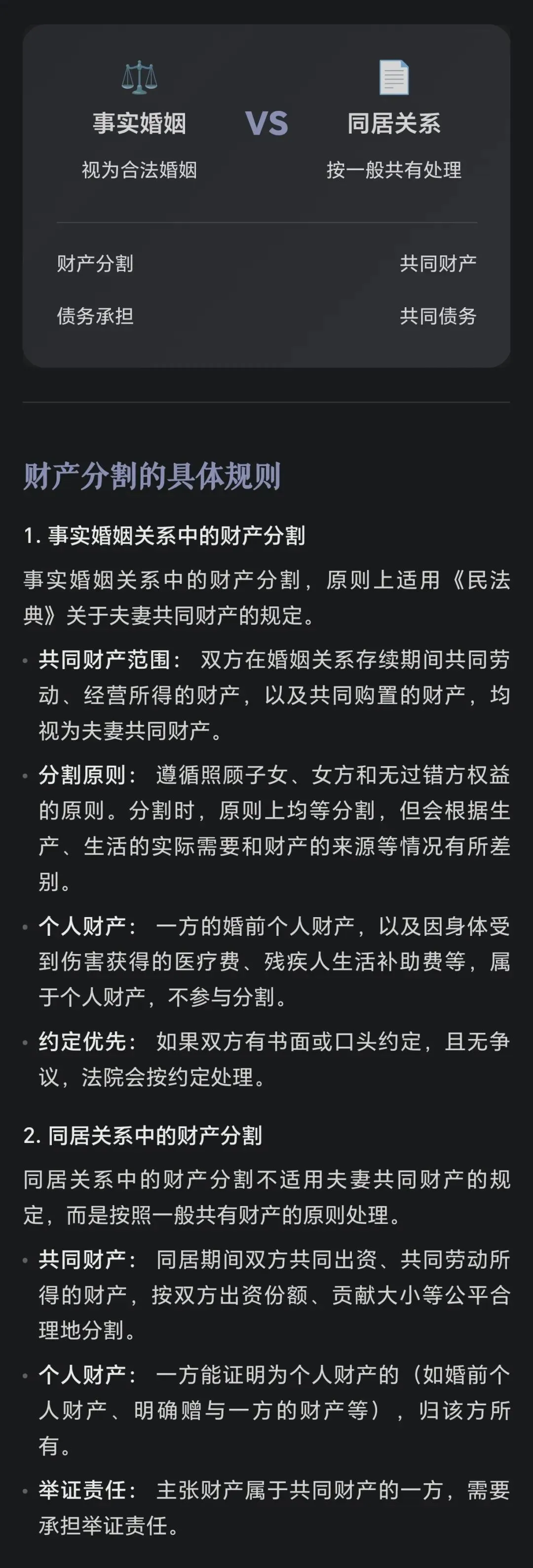 简单来说, 事实婚姻 被视为具有法律效力的婚姻关系,其财产分割和债务承担规则与登记婚姻基本一致。而 同居关系 则属于非法同居,其财产分割遵循一般共有财产原则,不适用夫妻共同财产的规定。