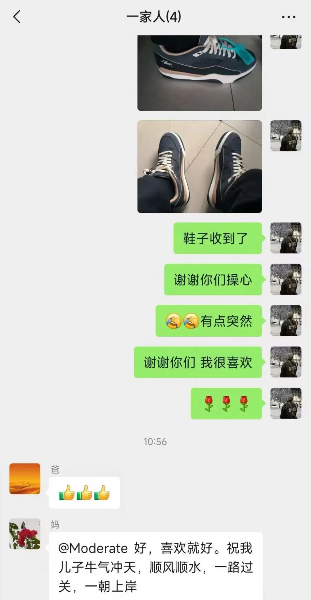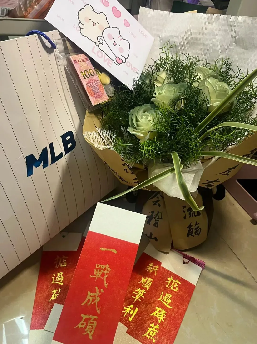 起初我想准备一束向日葵,寓意“一举夺魁”嘛,但是总觉得少点新意,另外其实我想说:“我希望你考上,但是如果没有,我也依旧觉得你是最棒的。”所以不想在寓意上就让他有压力。后面准备了“禁止焦绿”,和我手写的一些祝福,和阿姨商量偷偷把他喜欢的鞋买下来了,其实是我们一直喜欢的情侣鞋,他一直想和我穿一模一样的。