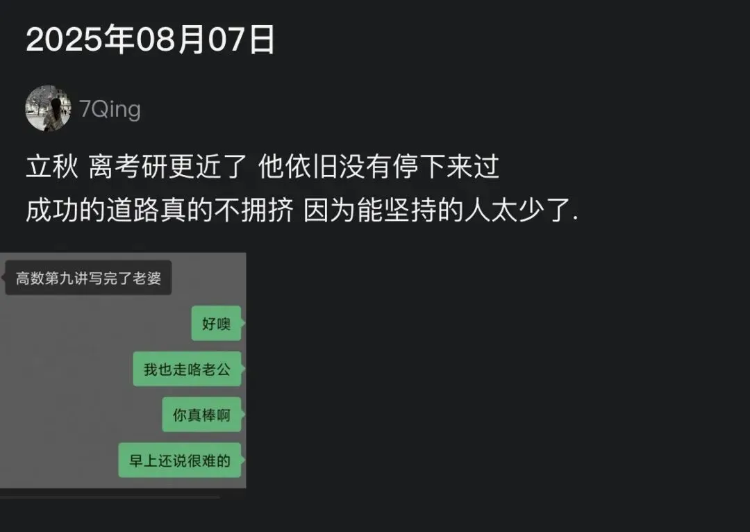 我想和你一起给你这么久的努力画个完美的句号,这无关结果如何,这个过程顺利走完,已经值得庆祝。有时候我在想,我们之间每每越过一个坎,就离走到最后更近了一步。而在这个过程中遇到的困难、经历的摩擦,最后都是铺垫。只有我知道,这一整个冬天,你顶着零下的寒冷无数次迎面吹着冷风回宿舍,几乎每天都学到很晚,想到你孤独地在这小小的四方桌渡过了春夏秋冬,真的是很不容易,无数次的情绪崩溃想要放弃,无数个疲意和失眠的夜晚,你都坚持走了下来。有时你总否定自己责备自己不够努力,可是我想说你已经很棒了,你一定会取得不错的结果!在过去的时间里我总自私地想时间要是过的快一点就好了,这样就能早点见到你,你每天都会跟我分享今天的情况,但从没有把负面情绪带给我,只是偶尔会说一句:我想你了,在备考学习的同时还要兼顾着我。看在你这么努力的份上,幸运之神一定会眷顾你的,不管最后怎么样我们都要一起吃大餐!无论结果如何,在我心里,你早已经是最棒的,是永远的第一名🥇。这份肯定不需要任何一次成绩和学历来证明。能陪你度过人生又一个重要的转折点,我倍感荣幸,我始终觉得两双眼睛看向同一个未来才是值得庆幸的事。最后的最后,想跟所有26考研学子说一句,你们辛苦了,记得考完好好爱老几。