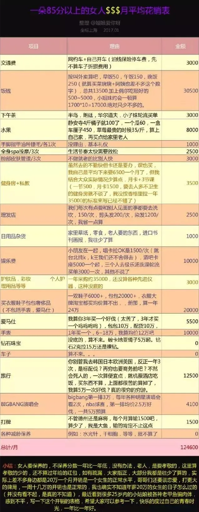 就以上海妹子为例,因为近日,微博上一位上海姑娘发了一份【一朵85分以上的女人,月平均开销表,总计:124600/月】,引发热议。很多人表示一年赚的钱也不够姑娘一个月花的!
