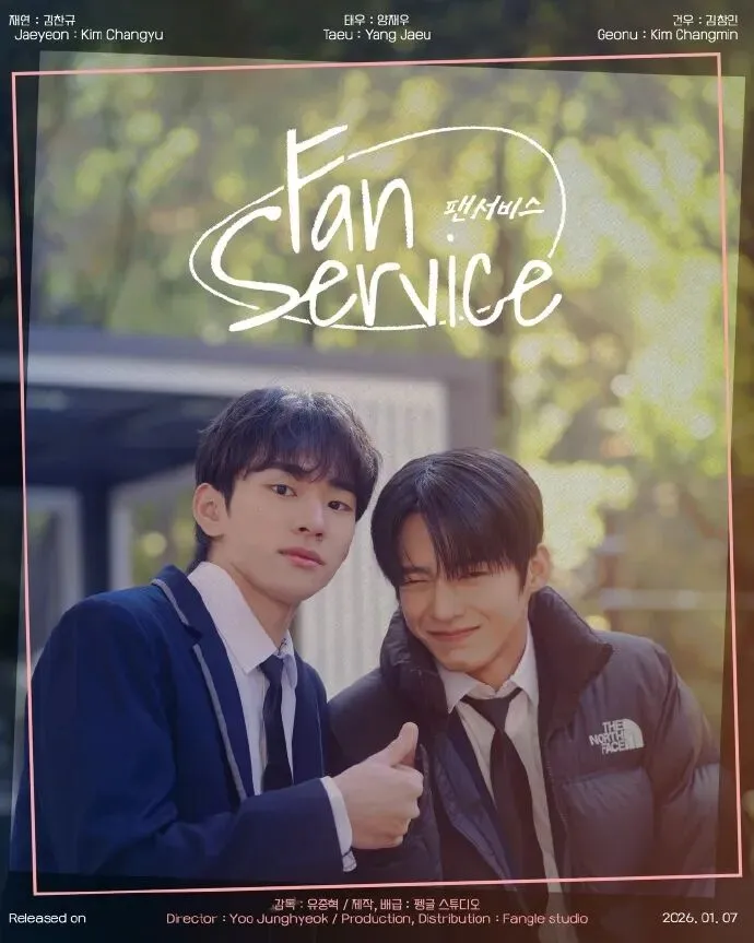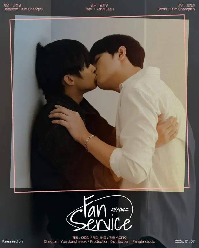嘉宾金昌珉、金灿圭,以及另一位演员JAEWOO(音:在宇)出演的最新BL网剧《粉丝福利》(팬서비스,Fan Service),1月7号也上了,属于是娱乐圈、轻悬疑、跟踪狂的故事