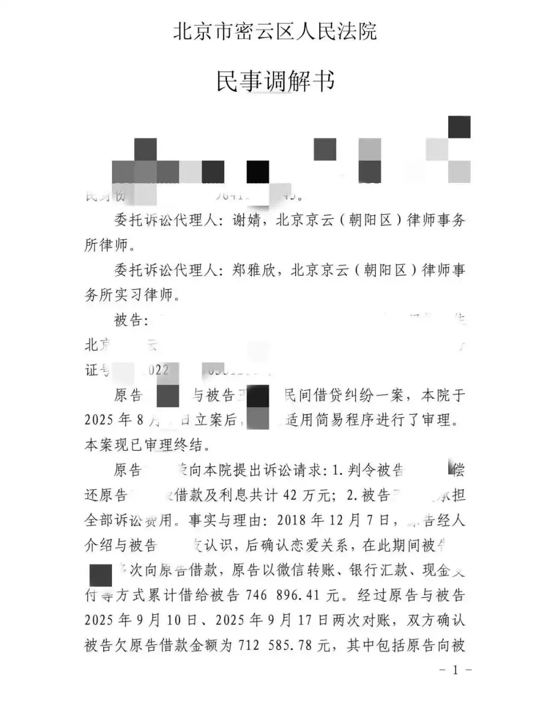 当情感关系与金钱借贷相互交织,往往会给当事人带来双重伤害。近期,谢婧律师团队成功代理了一起复杂的民间借贷纠纷案件,帮助当事人李女士(化名)通过法院调解,成功与对方达成分期还款42万元的协议,有效维护了当事人的合法权益。