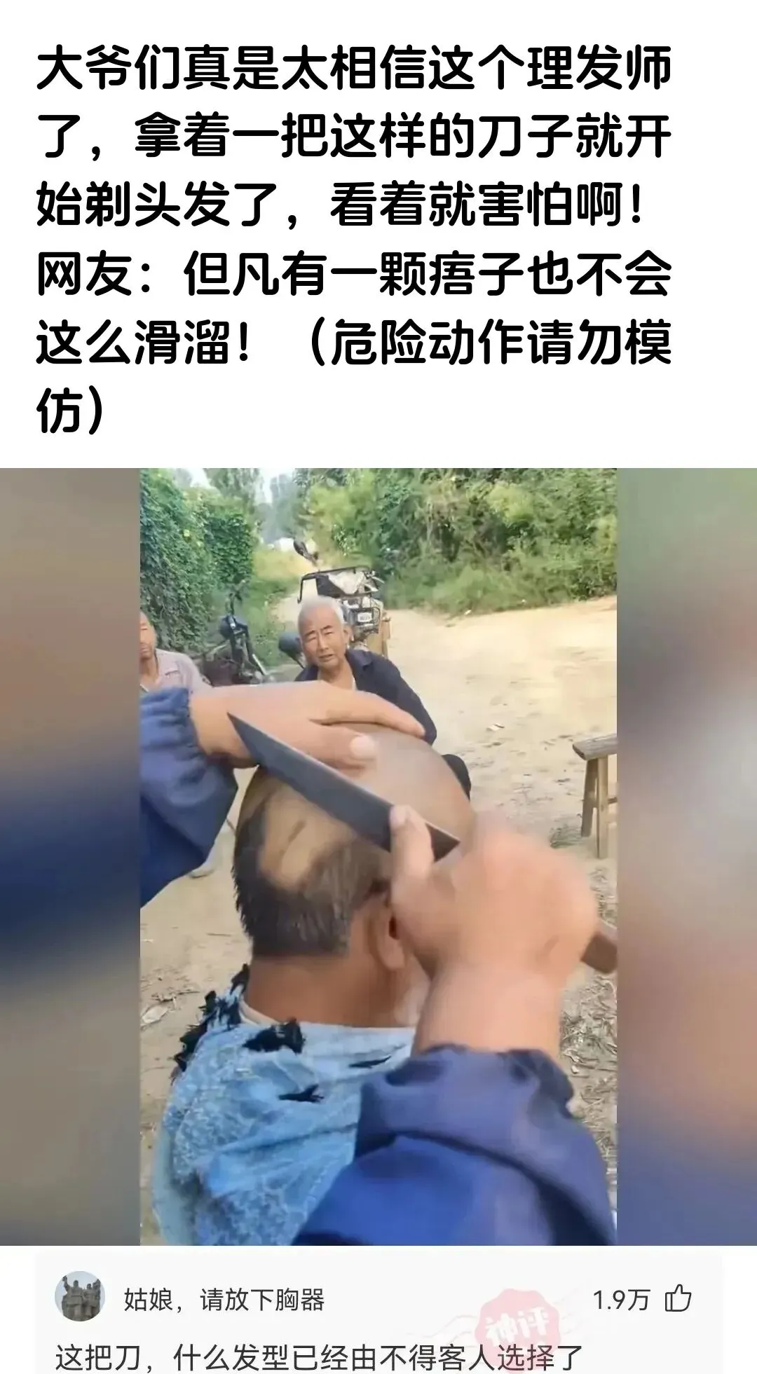 我的妈呀!这剃头刀看着就吓人!大爷居然这么淡定!网友:但凡有颗痣都能给削没了!