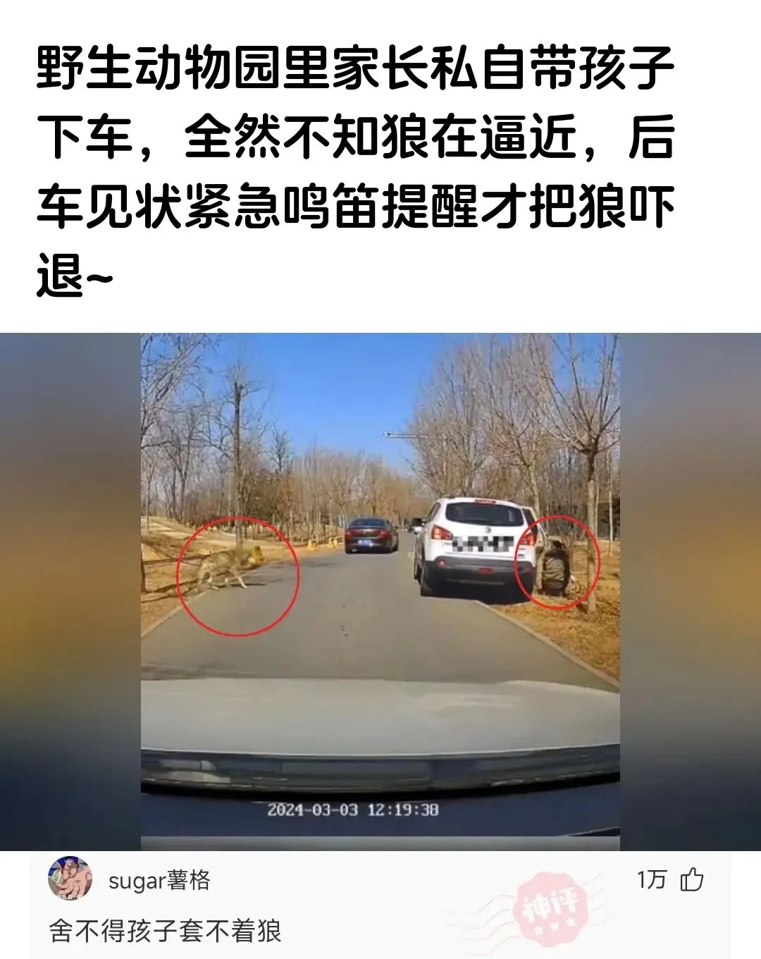 离谱!野生动物园下车遛娃?狼都蹲边上了!后车喇叭一响狼吓跑,这家长心比天大!