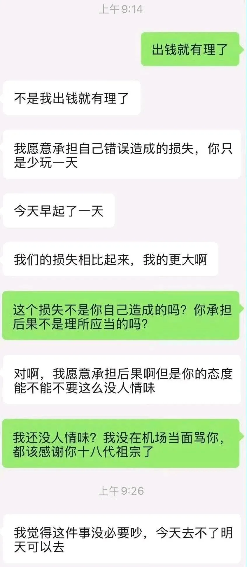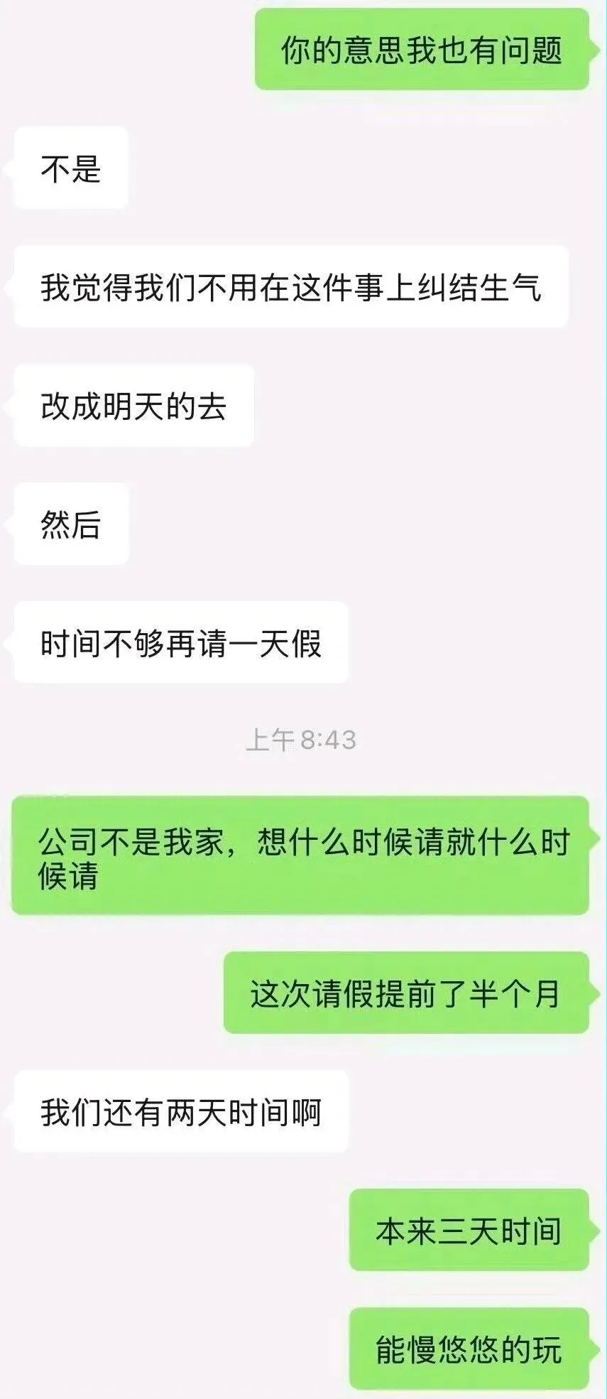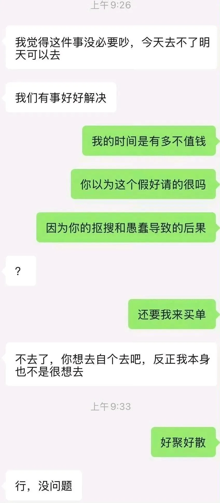 Reisende: 但是我感觉男生态度一直很好啊,也在想办法解决了。计划赶不上变化,请好的假当天也可以换个地方一起玩一下。女生越骂越难听,也是没必要了。分了好