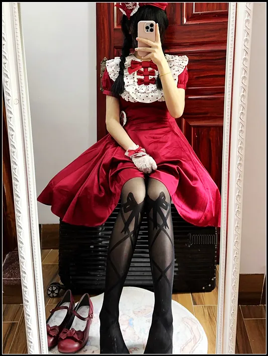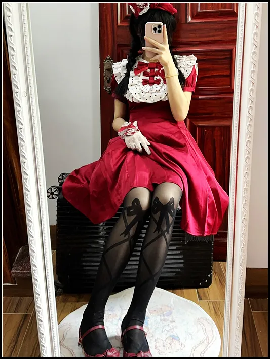 每一次精心打扮都像给生活撒上一把糖!这身酒红色裙装,搭配甜美蝴蝶结和精致蕾丝袜,气质瞬间拉满,少女心直接飞升天花板!无论日常约会还是闺蜜聚会,仪式感满满,回头率爆表!