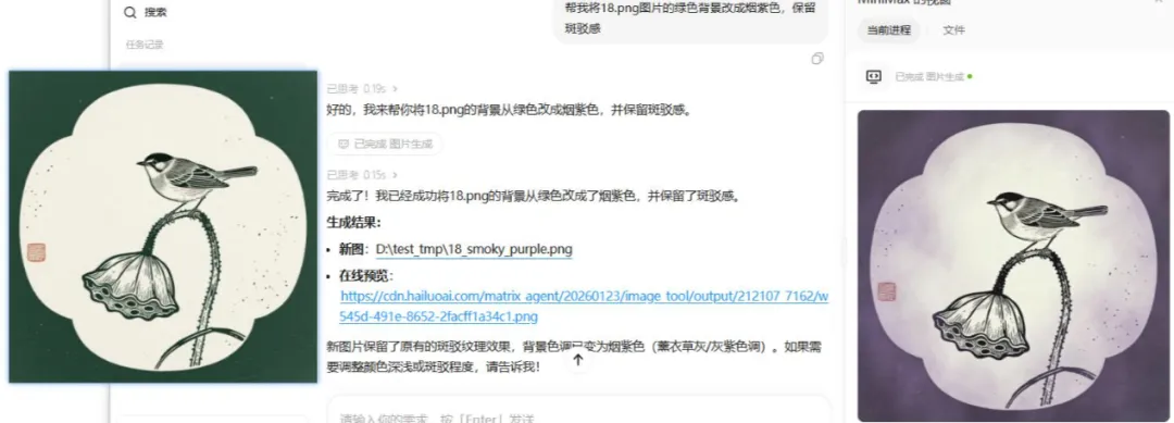 而MiniMax的图片处理功能,支持无水印生图和图片处理,输出的图片干净利落,