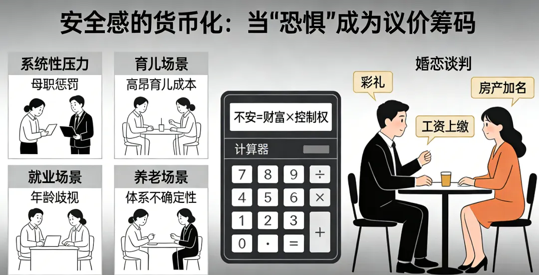当代中国的婚恋谈判桌上,一种新的逻辑正在悄然取代传统的情感与承诺。婚姻,这一被视为爱情归宿的社会制度,正被越来越多地操作为一场针对个人系统性风险的“折现”与“转嫁”交易。本系列旨在剖析这一扭曲逻辑的形成、运作及其荒诞后果。一、安全感的货币化:当“恐惧”成为议价筹码