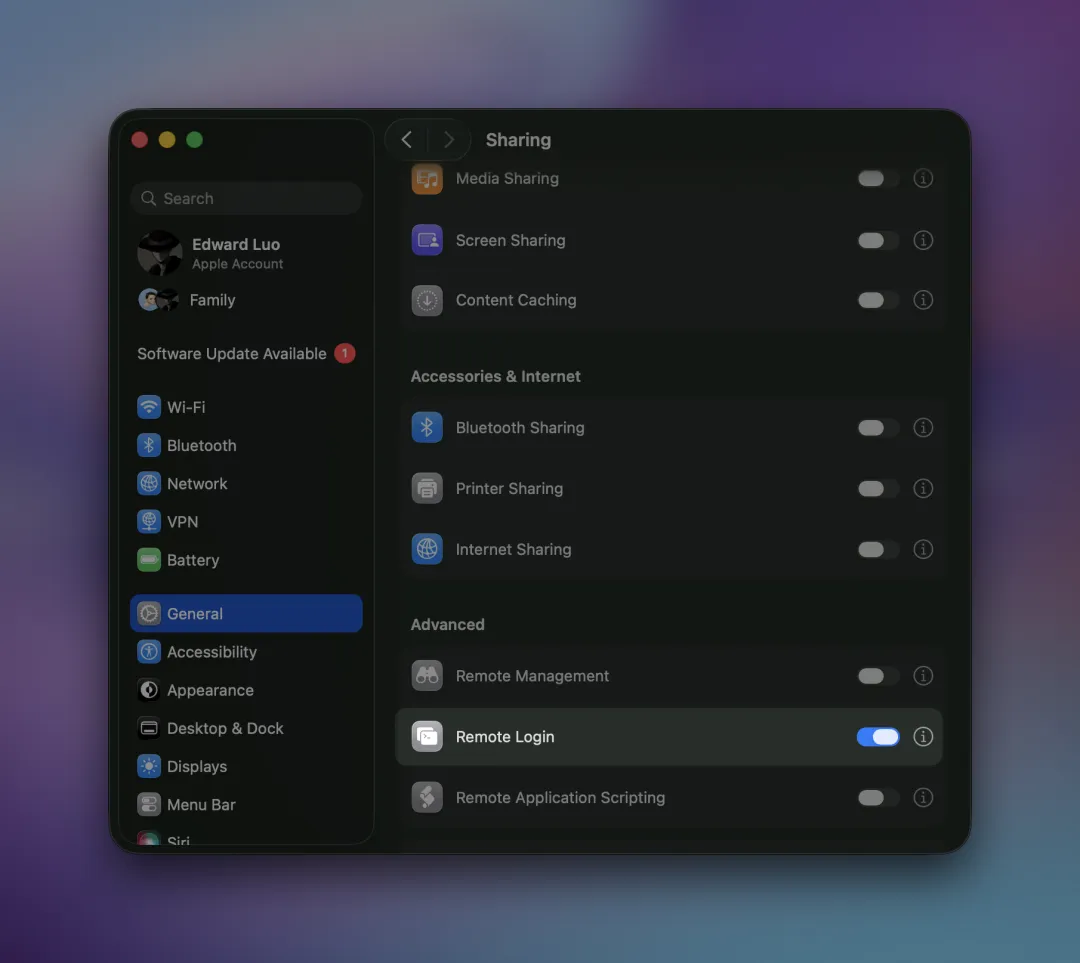 系统设置 → 通用 → 共享 → 打开「远程登录」