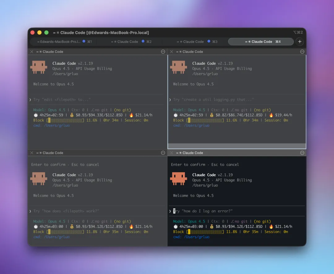 如果想要提升效率,可以通过 iTerm2 + tmux 开多窗口/分屏并行跑多个 Claude 任务,这是一种进阶的 Claude Code 使用方法。Claude Code 的创始人 Boris 就是这么用的,他会同时开 5-10 个窗口并行跑任务。