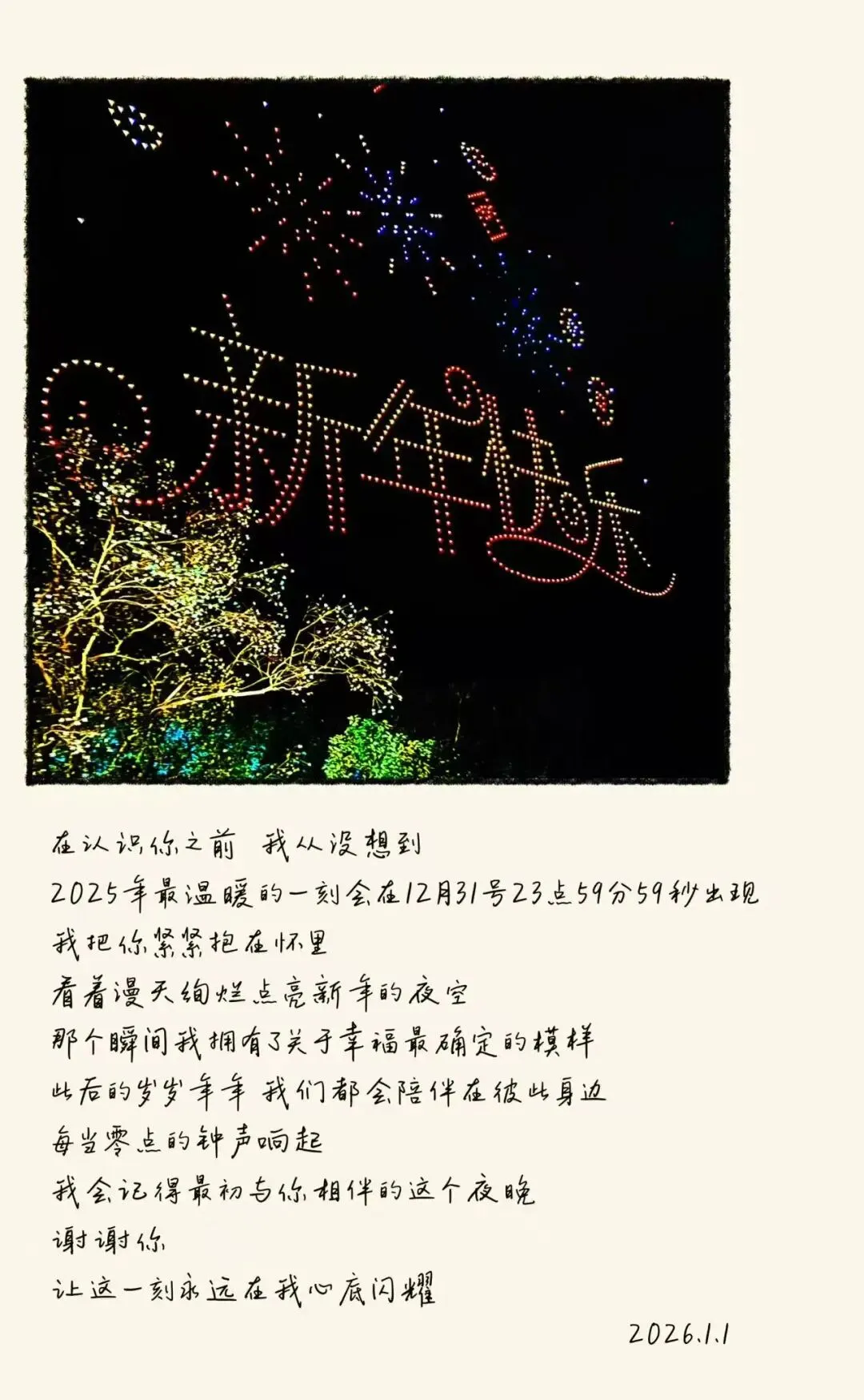 在认识你之前我从没想到,2025年最温暖的一刻会在12月31号23点59分59秒出现。我把你紧紧抱在怀里,看着漫天绚烂点亮新年的夜空。那个瞬间我拥有了关于幸福最确定的模样。此后的岁岁年年我们都会陪伴在彼此身边。每当零点的钟声响起,我会记得最初与你相伴的这个夜晚。谢谢你,让这一刻在我心底永远闪耀。(十天后,我们就这样“冲动”地结婚了)