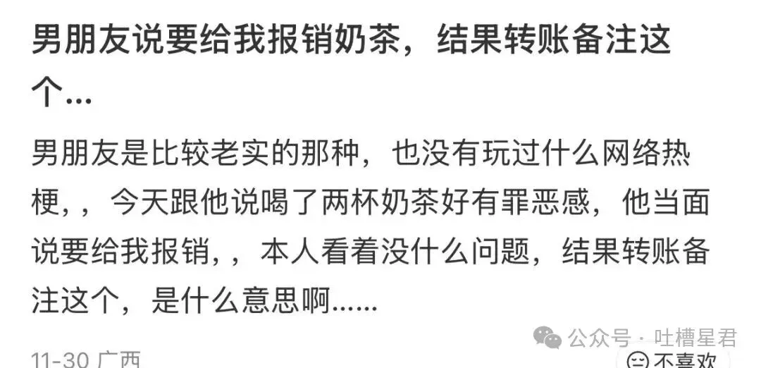 男朋友给我报销奶茶却备注非自愿赠与…?