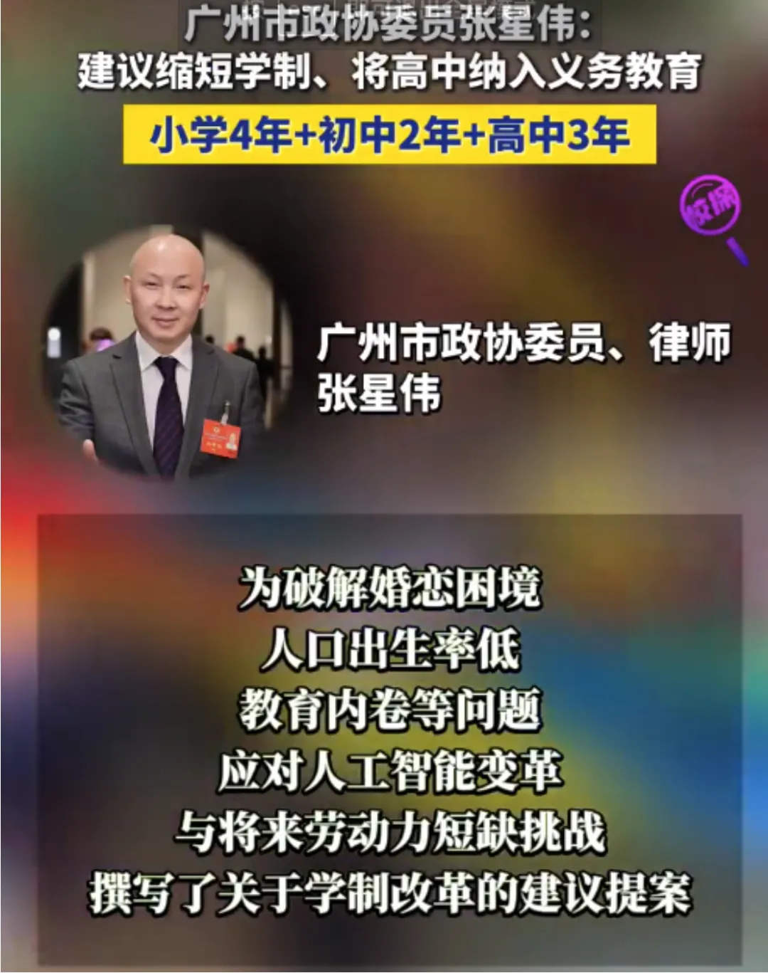 为破解婚恋困境、人口出生率低教育内卷等问题,近日广州市政协委员、律师张星伟在市政协十四届五次会议上提出提案《缩短学制,降低初婚年龄,提高人口出生率》,建议优化基础教育,推行小学4年+初中2年+高中3年九年义务教育模式,将高中纳入义务教育;完善高等教育短学制体系,推行本科3年、硕士2年、博士2年的教育模式;强化AI与教育融合,确保减学制不减质量。