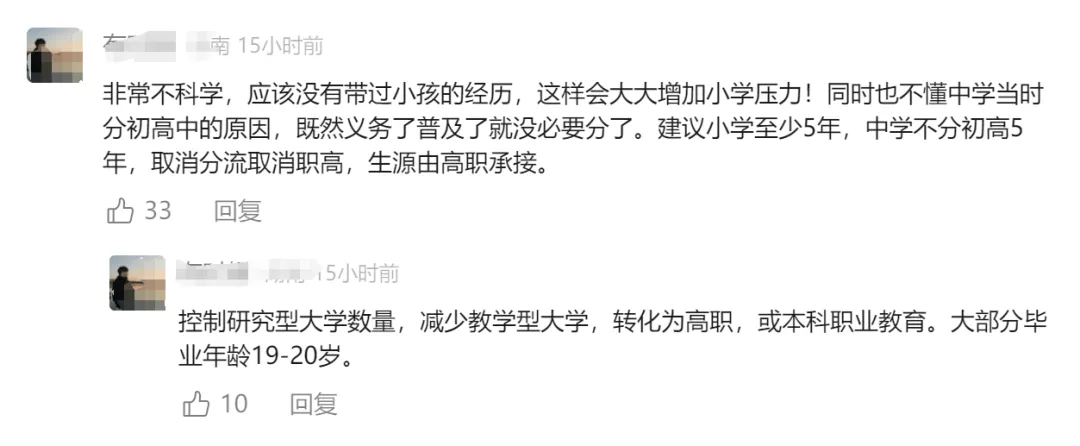 非常不科学,应该没有带过小孩的经历,这样会大大增加小学压力!同时也不懂中学当时分初高中的原因,既然义务了普及了就没必要分了。建议小学至少5年,中学不分初高5年,取消分流取消职高,生源由高职承接。控制研究型大学数量,减少教学型大学,转化为高职,或本科职业教育。大部分毕业年龄19-20岁。