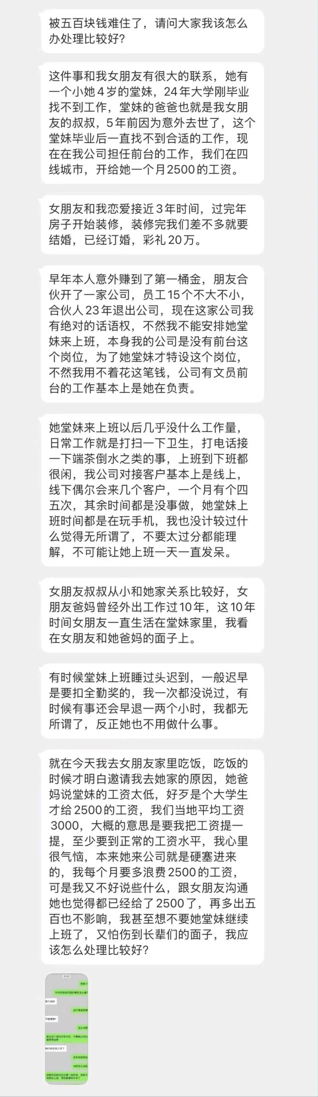 未悉悉悉: 这是她家欠下的人情不是你欠下的,创立公司的钱和本事都是你自己的不是你女朋友的话,你没这个义务一直迁就你女朋友,帮是情分不帮是本分,一个月500,三个月就1k5了,就不涨,如果你女朋友硬要涨就别一起了,以后要扶你女朋友堂妹家的事情还少吗?你们这还没结婚呢。
