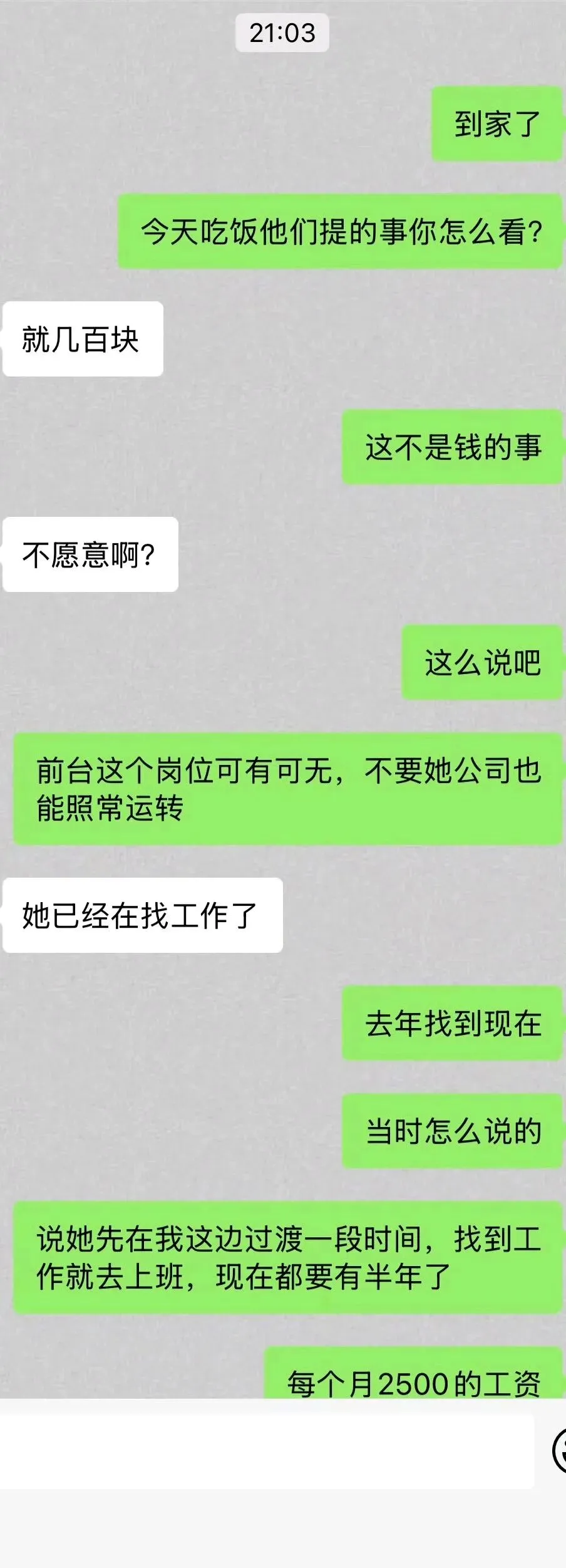 BuenosAires_: 你女朋友还真会说,他们家欠的人情你来还。而且还是一个可以取消的岗位。不是我共情老板,对于一个公司来说,一个月2500可以覆盖不少水电和网络费用了。要是一个月拿2500给员工聚餐,可比给一个天天迟到早退的好。