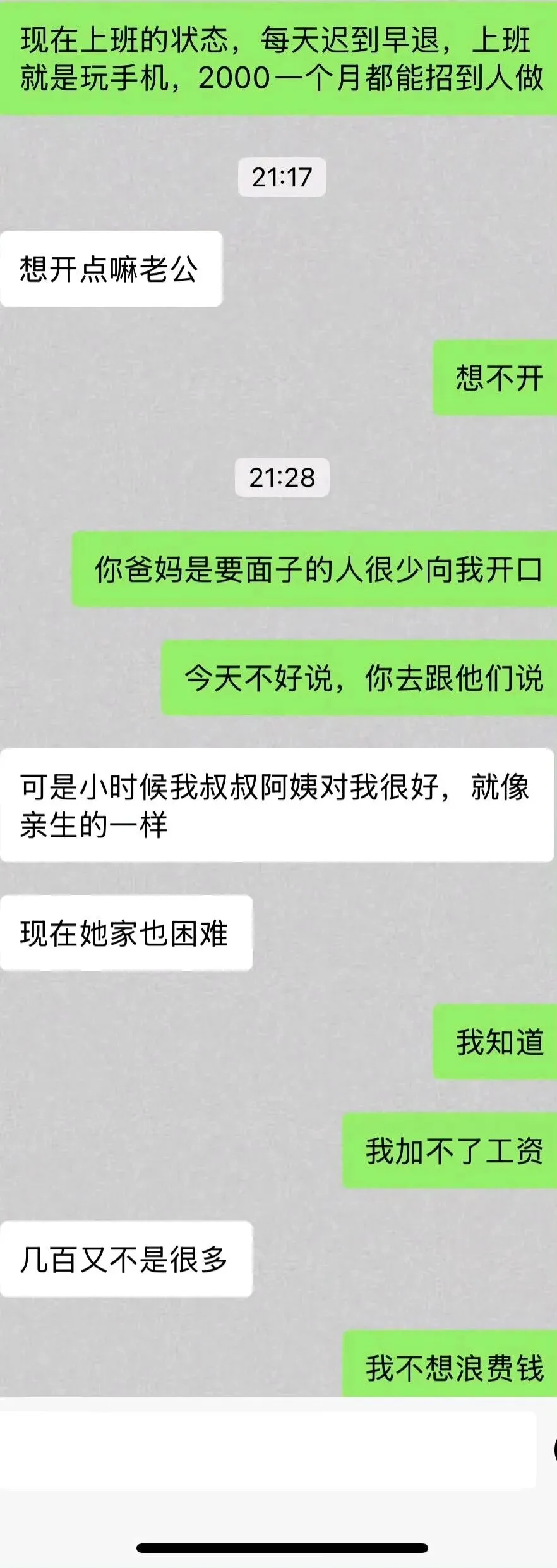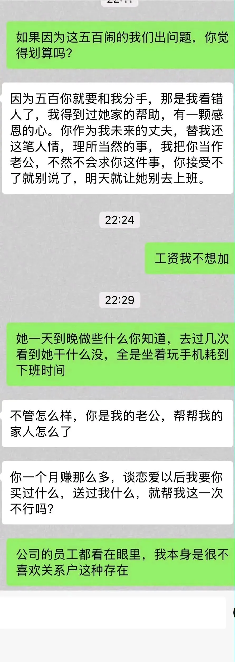 一个丸子啊_: 已经成仇了,女的用词都是“理所当然的事”,现在是涨工资是应该,不涨是遭恨。男方给女方家人提供了一个闲职岗位结果没人领情还落埋怨
