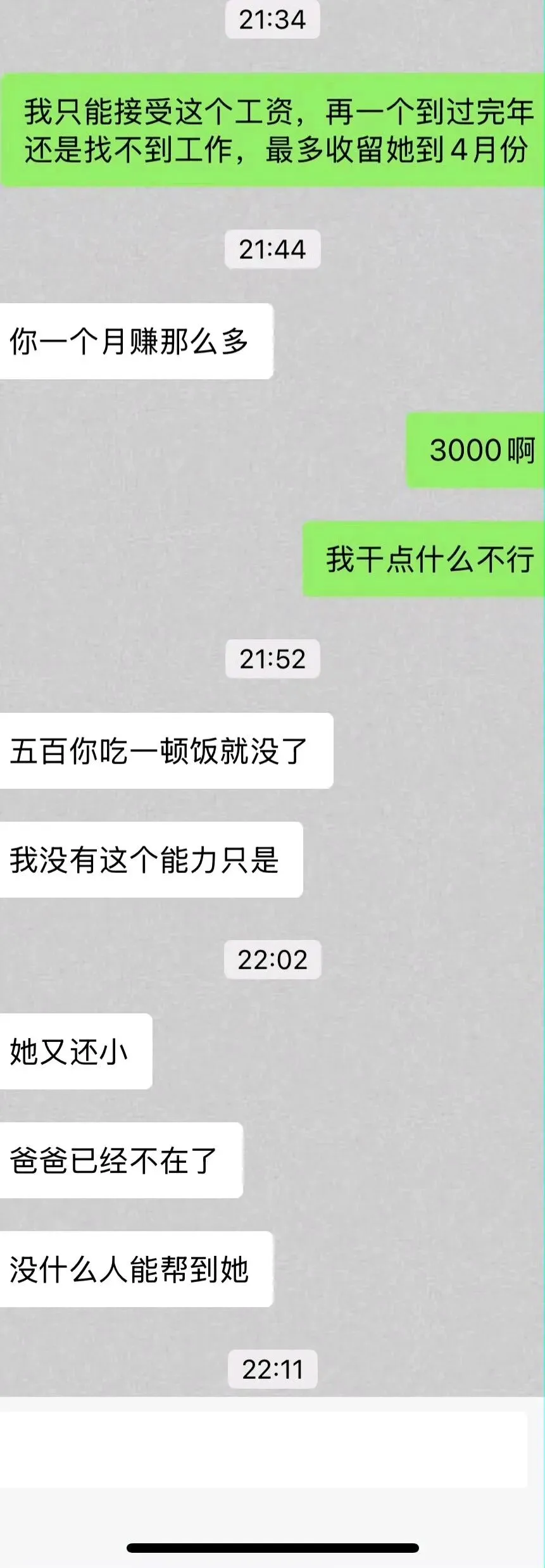 是个小猫咪呐: 讨来的饭还嫌馊,她家自己欠的人情自己还,你一个月2500你看有人领你情吗,他们只觉得是理所当然的,还嫌少呢