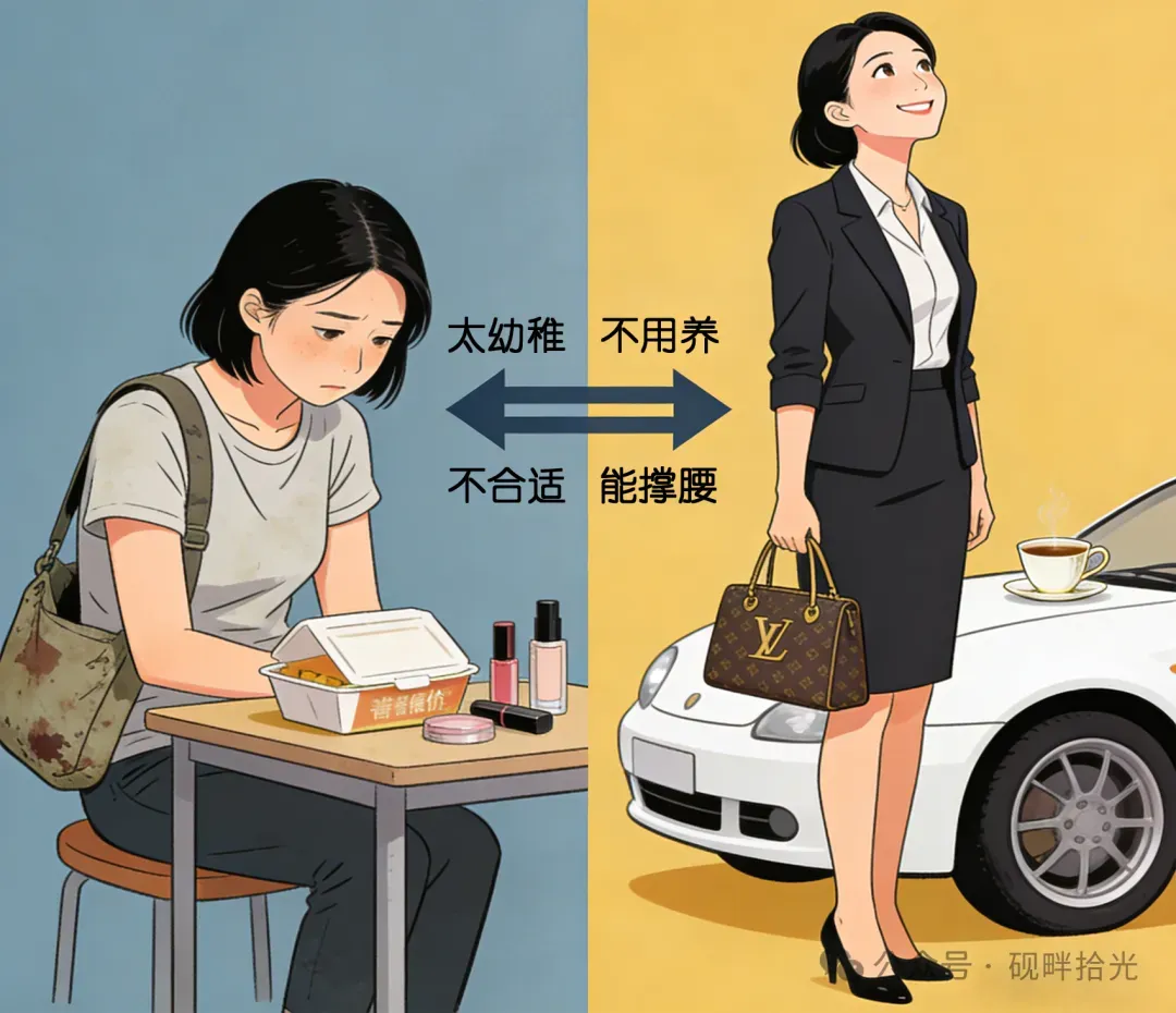 我见过身边有姐姐,恋爱时掏心掏肺,把攒了好久的钱拿出来支持男友创业,最后却被一句“你太强势了,我压力太大”甩得干干净净。也听过有人吐槽“某某姐都三十了还不结婚,肯定是太能花钱没人敢要”,可转头就对月薪三万、开小车的姐姐赞不绝口。
