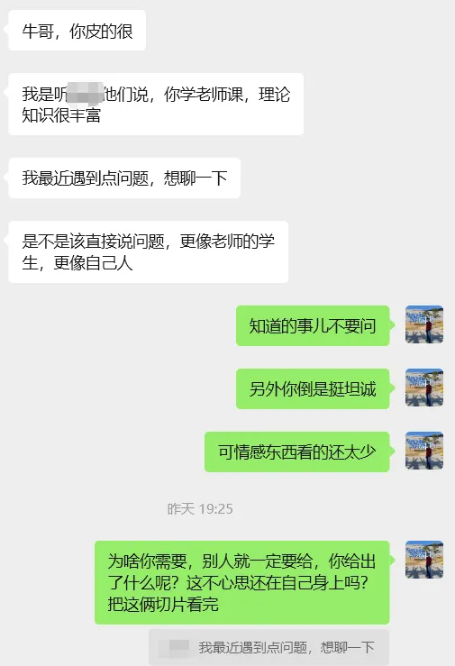 但对方不知是情绪烦闷还是心思不在,对话情绪感受让人觉得很公事公办,好在姑娘头像是自己,和我有微信1个多月,朋友圈有过几次出来和小伙伴们玩的照片。再加上情感问题就没有着急的事儿,找到一句很久之前聊过的话。
