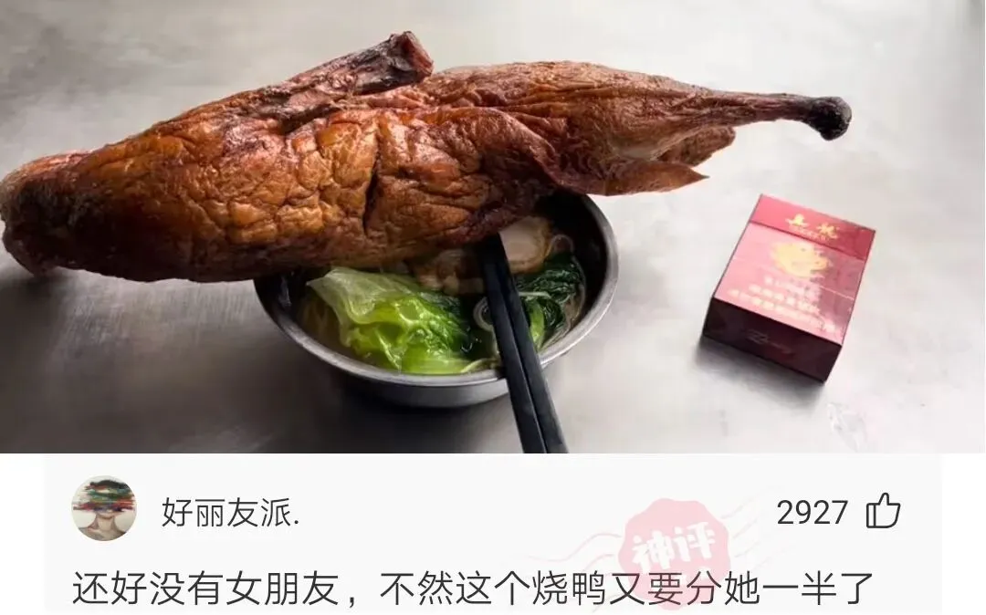 神回复:还好没有女朋友,不然这个烧鸭要分她一半了!
