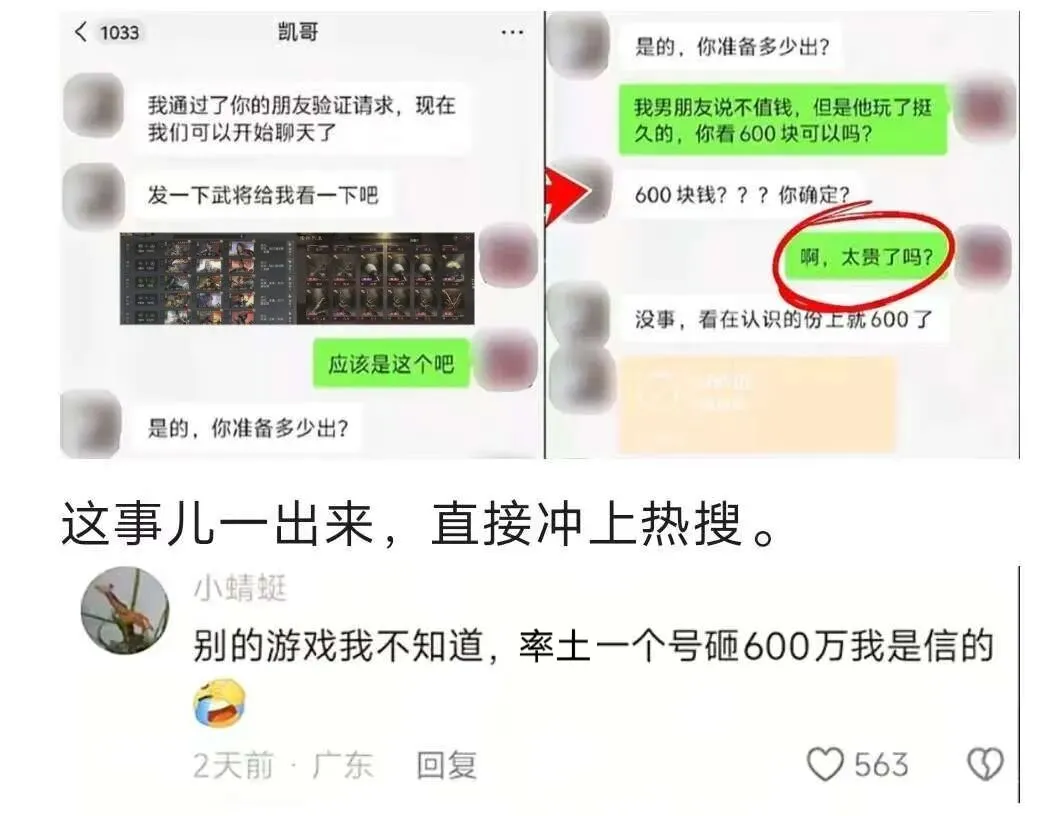 一哥们在游戏里砸了不少心血,光氪金就高达600个,结果他女朋友觉得他玩游戏不务正业,一气之下把他的游戏账号给卖了,就卖了600块,还挺得意。