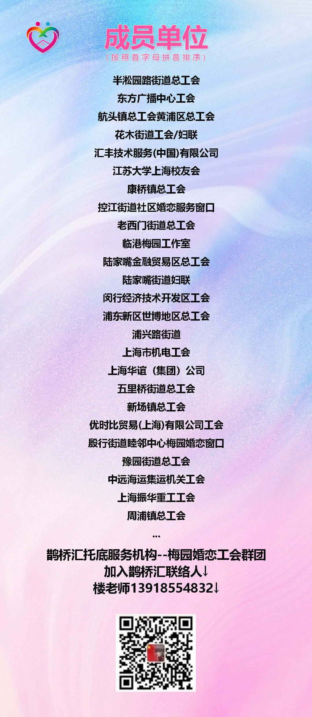 组织形态:由现有社区婚恋窗口、工会和群团婚恋工作室等自愿组成,吸引更多区、街镇和企事业单位参加。