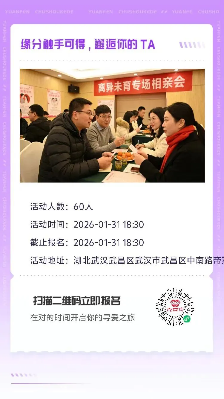 1月31日晚,武昌中南路帝斯曼国际中心,离异未育相亲会,或许就能遇见余生的温暖。