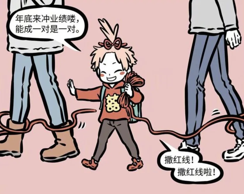 每逢年底,月老都要冲业绩,毕竟神仙们也有业绩考核。月老心态比较好,表示能成一对是一对。对于月老来说,只要红线两头有人,那就算成功。虽说月老不太靠谱,但他还是真想让大家有机会脱单。红线撒起来,那是一条接着一条。估计到年底,鸳鸯们也很繁忙,毕竟要找爱情结晶来做成红线,才能供月老使用。