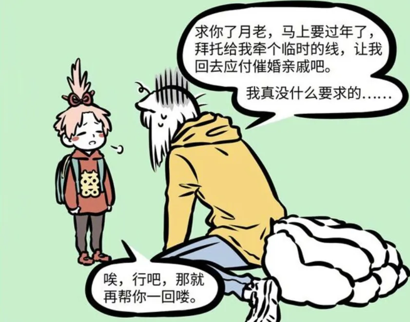 离过年那时越来越近,九月也想要脱单,她拜托月老牵红线,牵个临时红线也好。九月这么做,就是想回去的时候刚好应对催婚,不用被家人逼得那么急。九月还表示自己没什么要求,所以希望月老帮忙。实在拗不过九月,月老只能一边叹气,一边答应。