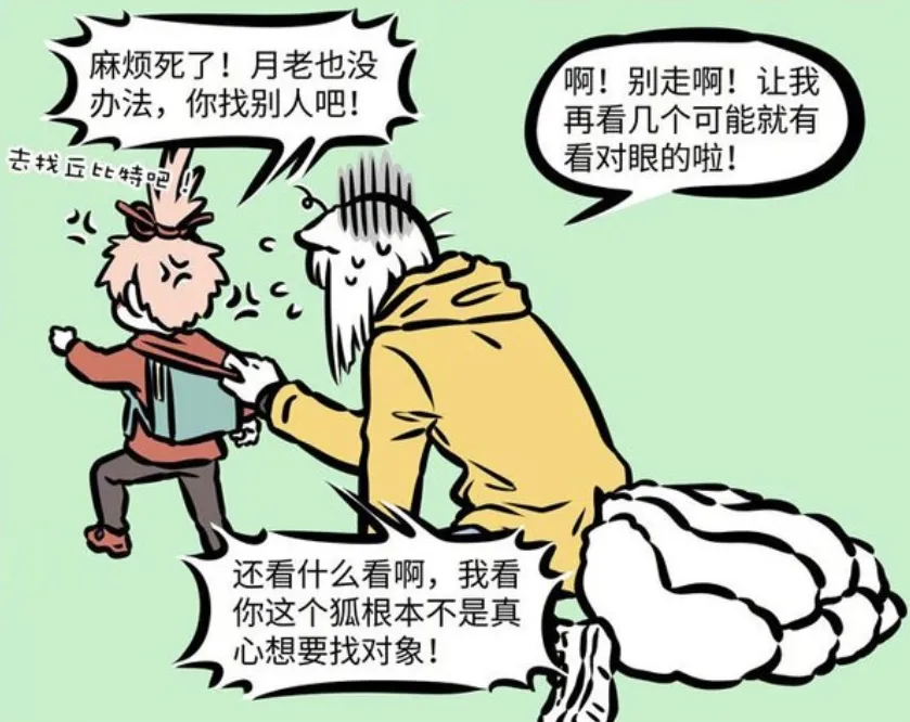 九月这哪是没有要求,那要求实在太多,大致是需要帅、长得高、工作好、有共同语言,还要喜欢一样的牌子,甚至还需要宅且有相同的cp要求,然而这还不是全部。正因为如此,月老才打算放弃,让九月去找丘比特。月老好不容易要给九月机会,可是九月却不把握。这还只是找临时对象,要是正式对象,那估计要写满一个本子。九月还想让月老继续帮她找几个,可是月老更加生气,这哪是找对象,明显是找茬。最终月老放弃九月,再也不过问她的姻缘。