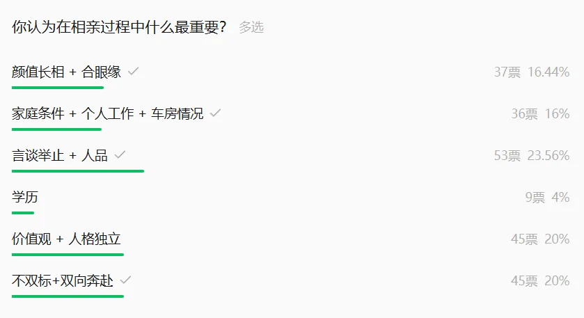 打开之前的写的一篇文章《你认为在相亲过程中什么最重要?》,具体投票结果如下: