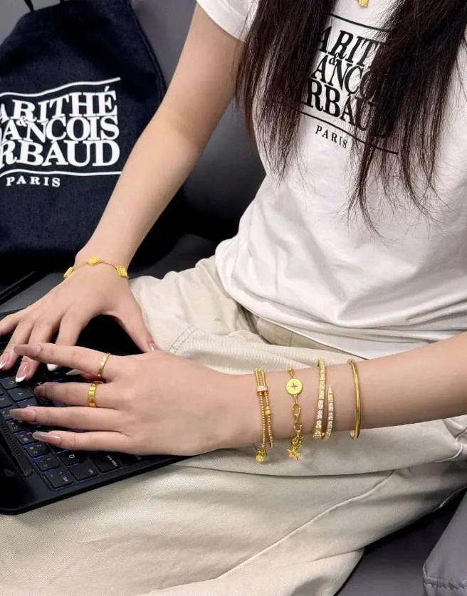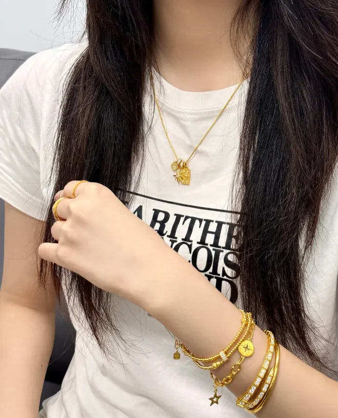 我问她 你为啥不买真的 她说买真金压力大 抽屉里放着也不戴 然后朋友聚会拍照就看个闪 我突然被戳到了 我年轻时候也追过潮鞋 花两千多 转头跌成八百 心里疼得要命 这几年我开始每月攒点小金豆 1克 2克 慢吞吞地 逛到店里看今天一千多的标签心里也会哆嗦 但握在手里有分量 这分量是踏实感啊💎