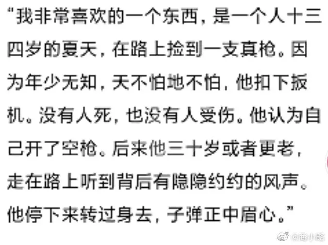 很像加缪的那句“我们四十岁时死于一颗我们在20岁那年进自己心里的子弹”@Awwwegd