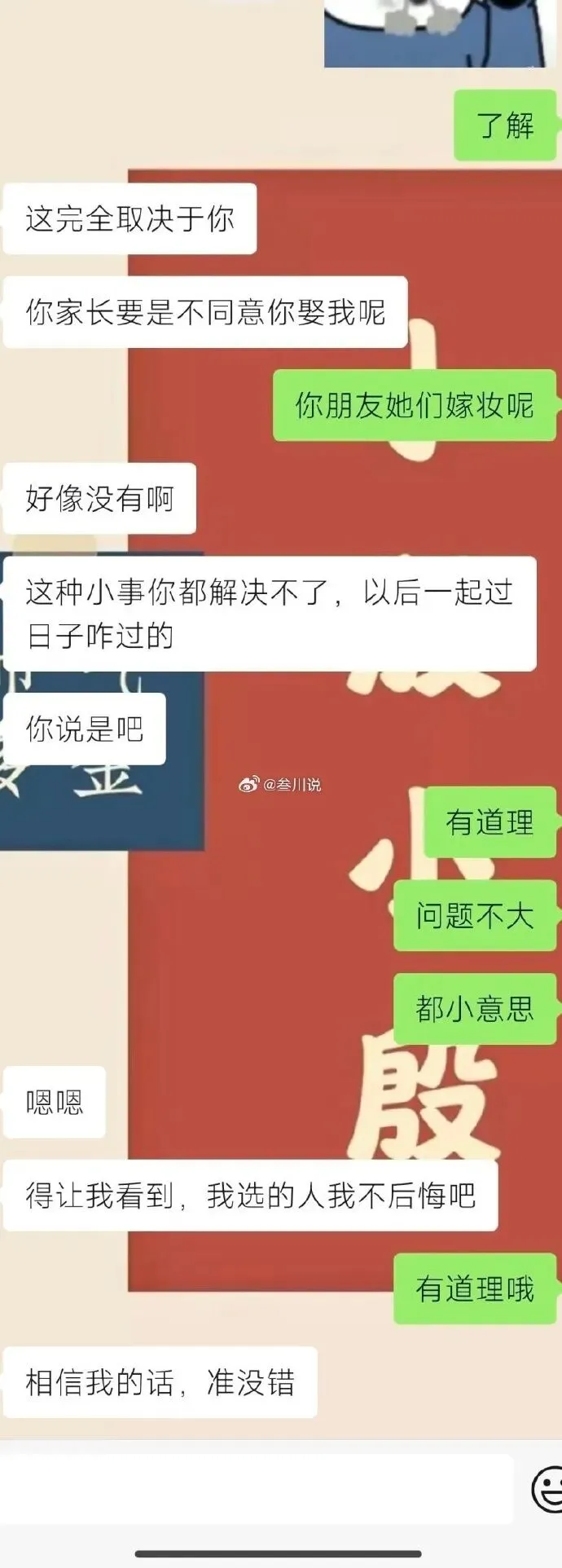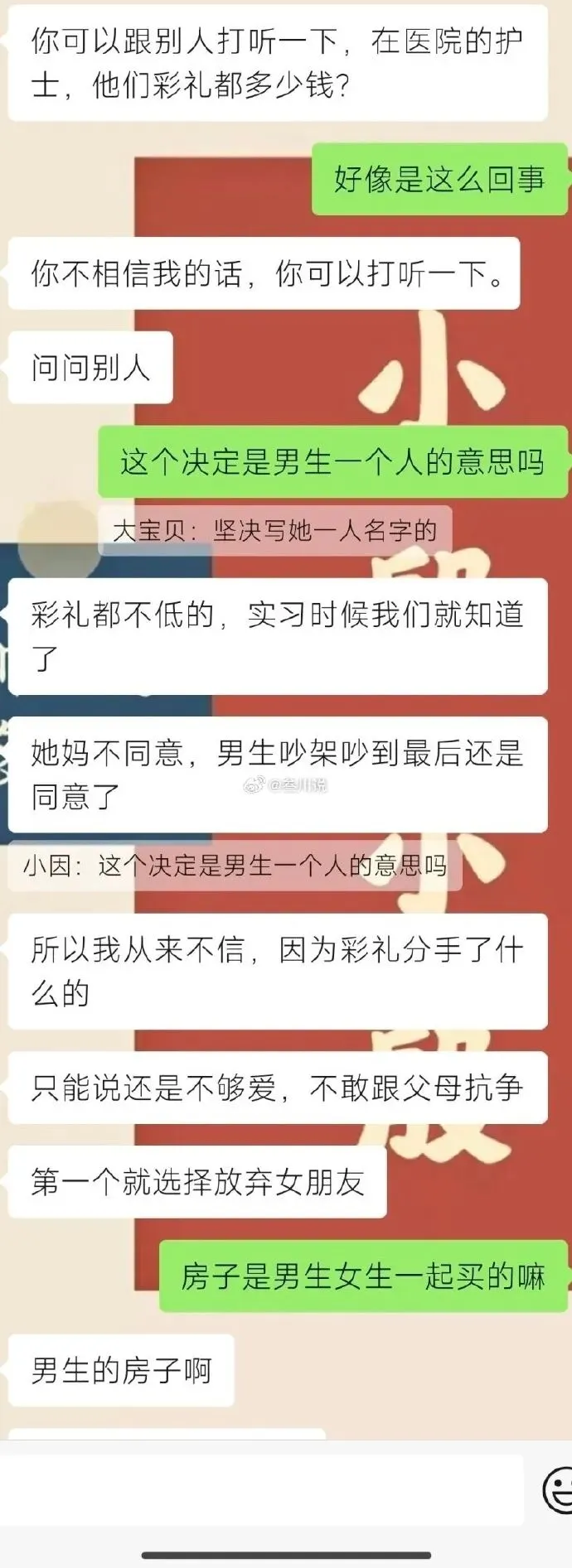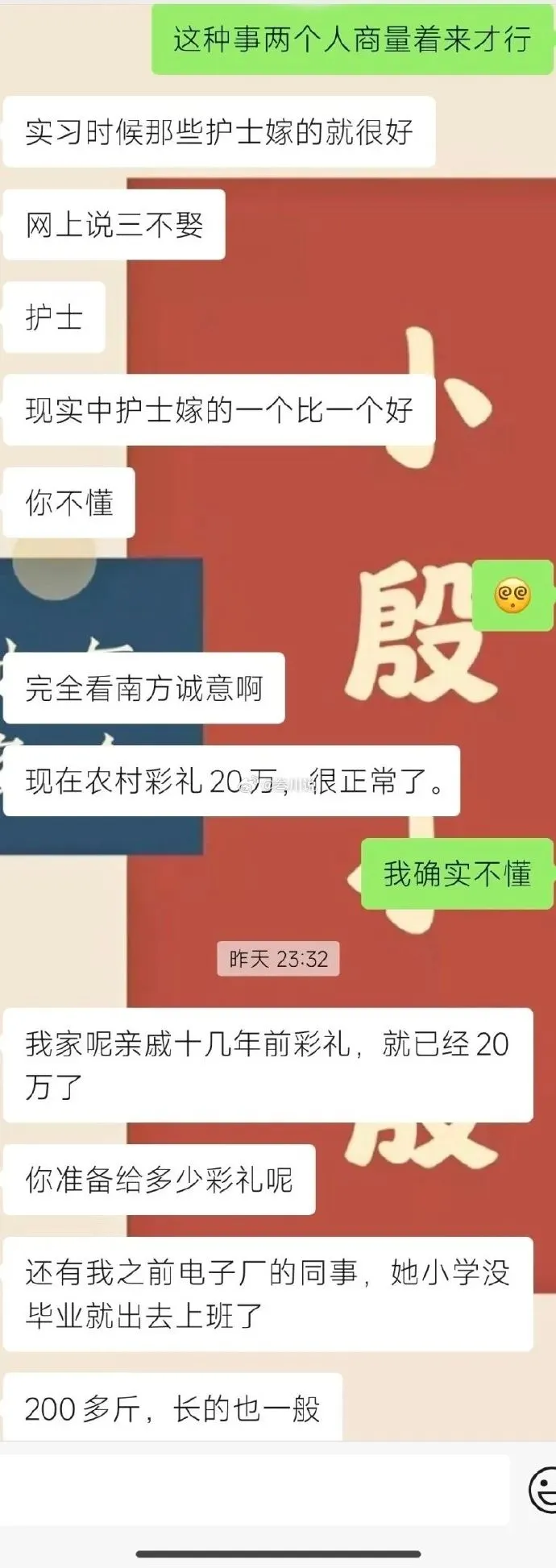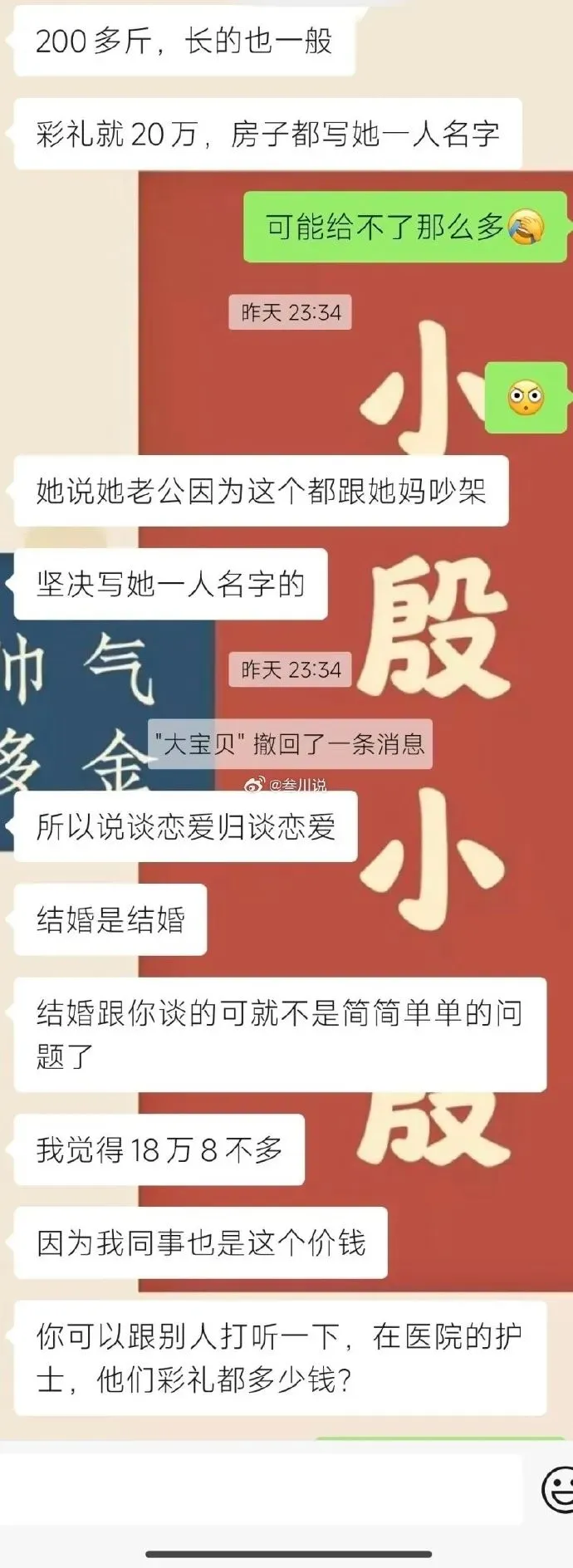 @阿迟:想要彩礼多给的,找愿意给的;不愿意给彩礼的,找不要彩礼的;你俩不合适可以分了