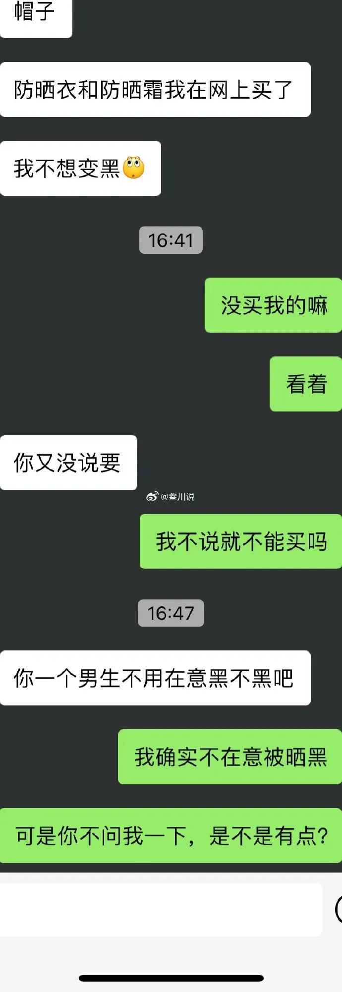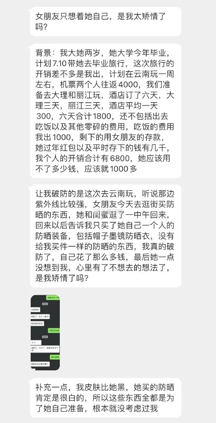 @一打糖球:我觉得重点不是男生有没有开口要,而是女生只为了自己做准备,完全没有想过男生。两个人一起的旅行,应该两个人一起商量,即便她没多买一份,也应该有提醒的义务。她在为自己买这些东西的时候,哪怕先问一句墨镜防晒衣这些你都备好了吗,看聊天记录大概是问都没问过,说明她没那么关心男朋友。