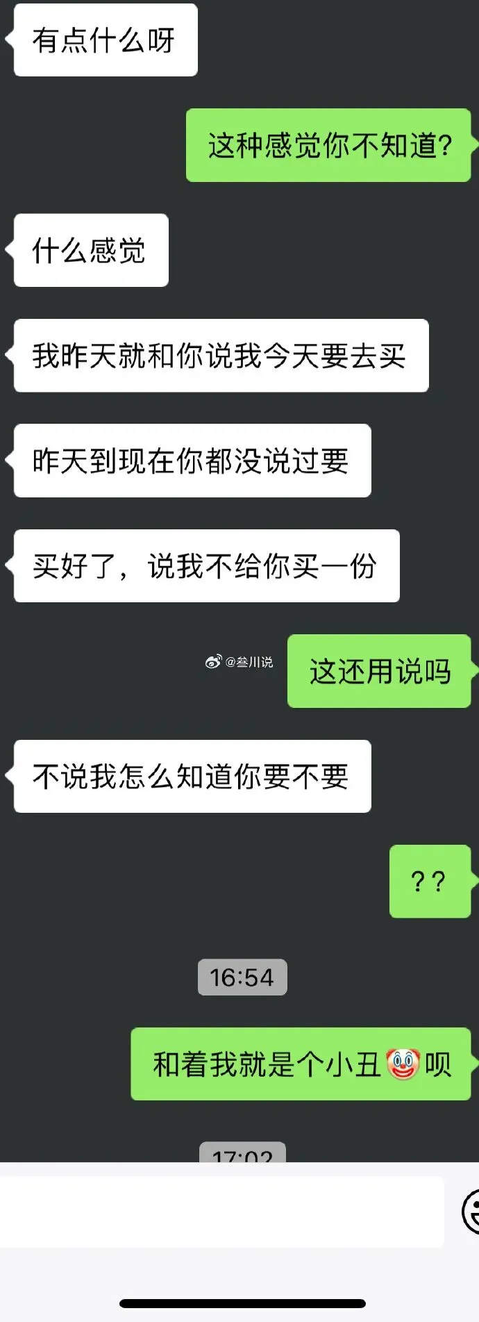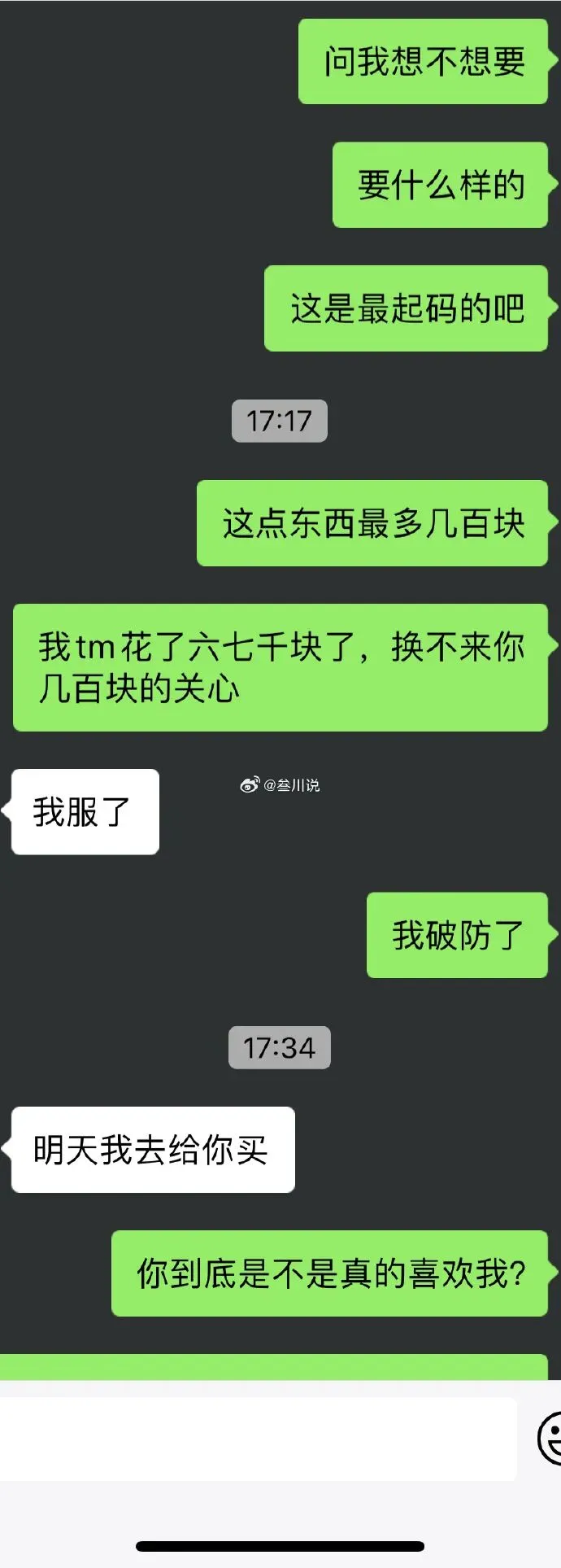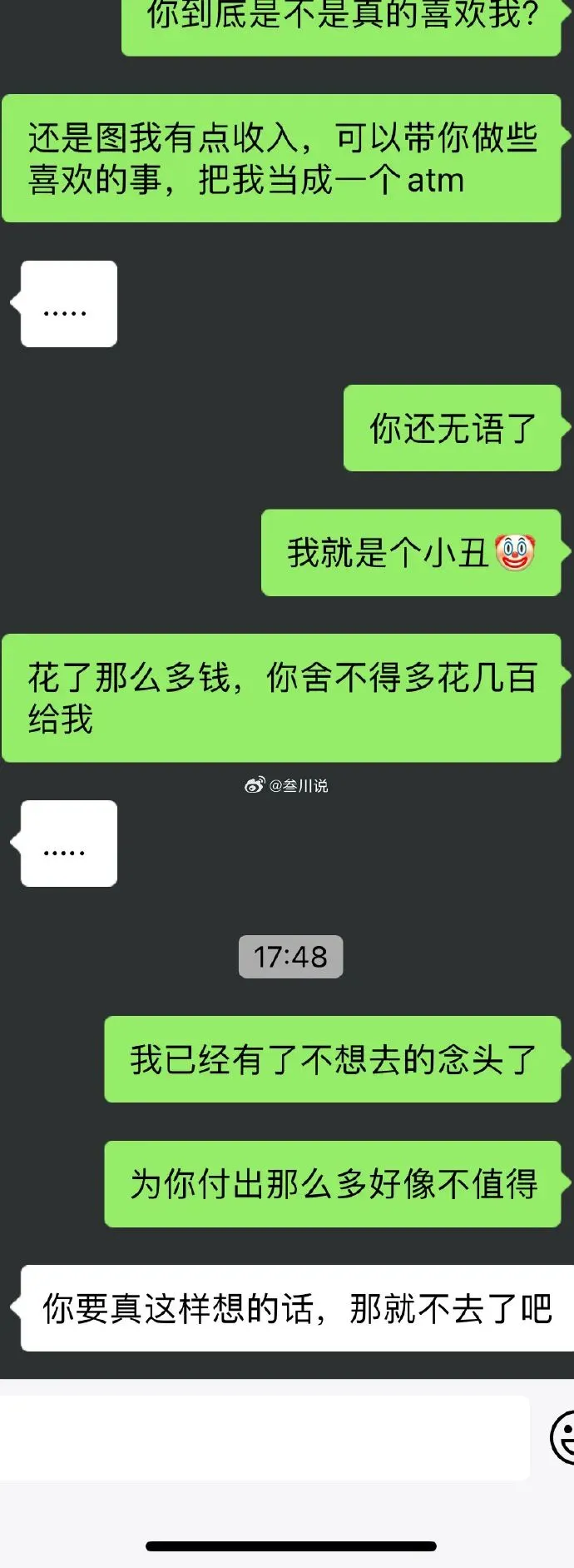 @小鲨鱼:从投稿就能看出男生一直在强调钱的问题,说明花这个钱对男生心态影响是很大的。男生在女生没买自己东西后,以女生不考虑自己为由向女生表达不高兴,语气逐渐变的质问,并很快扯到钱的问题上,实质上是男生更在乎自己花钱的事,女生没买男生东西确实存在不够考虑男生的问题。