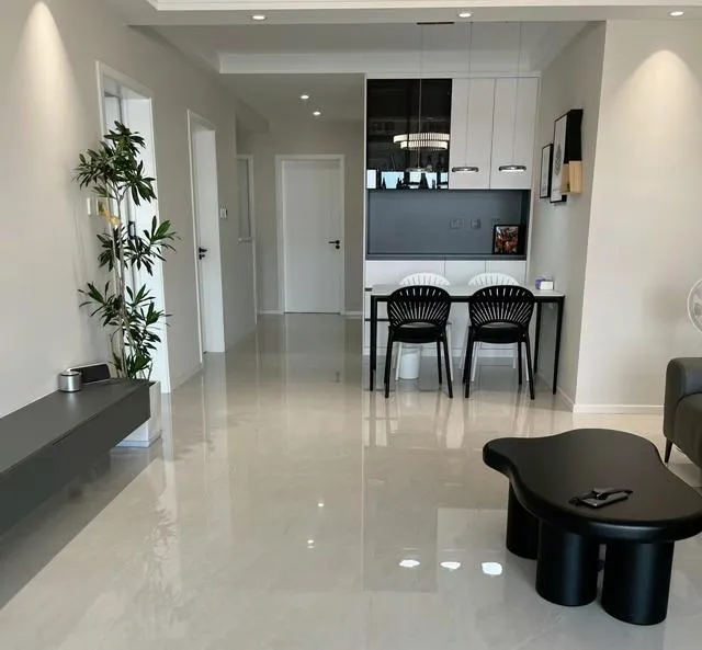 第二个问题是越看越单调。刚装完的时候,家具还没进场,看着确实挺开阔的。可等沙发、茶几、电视柜一摆,你会发现那个通铺的效果根本就没了!露出来的就是一块块零碎的瓷砖,看久了真的审美疲劳。