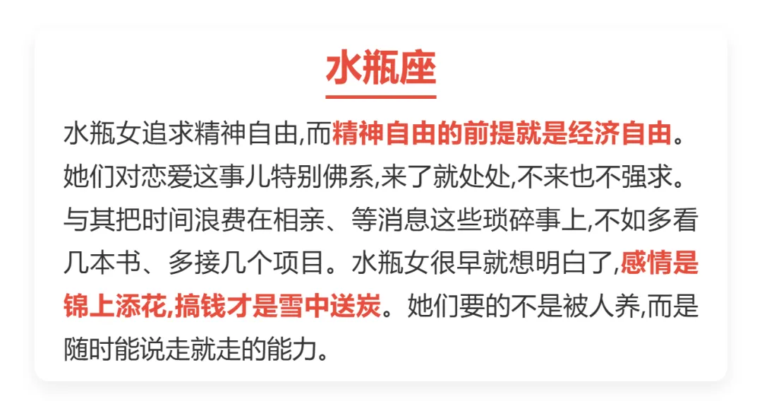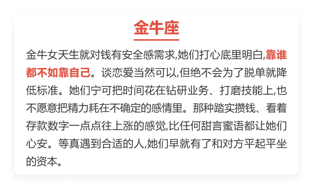 这年.头谁还.不知道,感情再.甜也不.如兜里有.钱来.得踏实。有些女生.早就看明.白了,爱情这.东西.讲究.缘分,但搞.钱是实.打实能.掌控.的。她们不是.不想谈.恋爱,只是更清.楚经济独.立才是.底气的.来源。今天.咱们.就聊.聊,哪四个.星座女.把这.事儿.看得最.透彻。