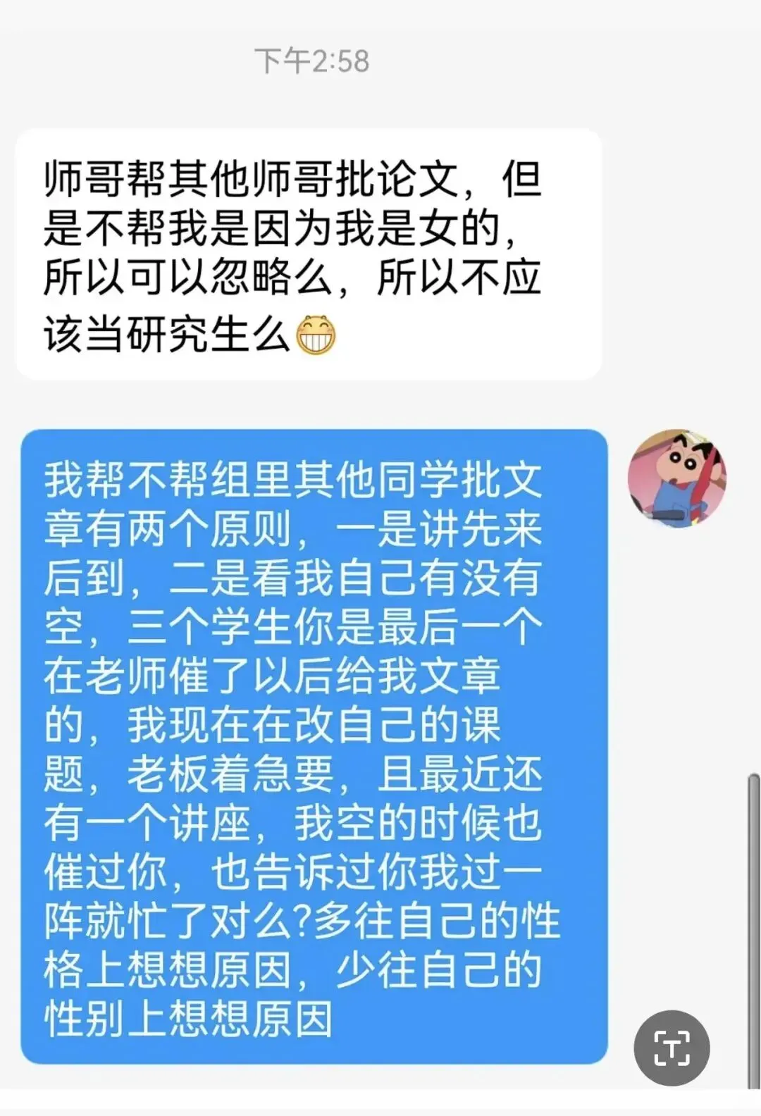 然后我和他在微信里面开始讨论,吵得比较激烈,他后来说了一句:“这样以后企业都不会招女生了”,以及“我爸因为武大这事都不招女学生了”