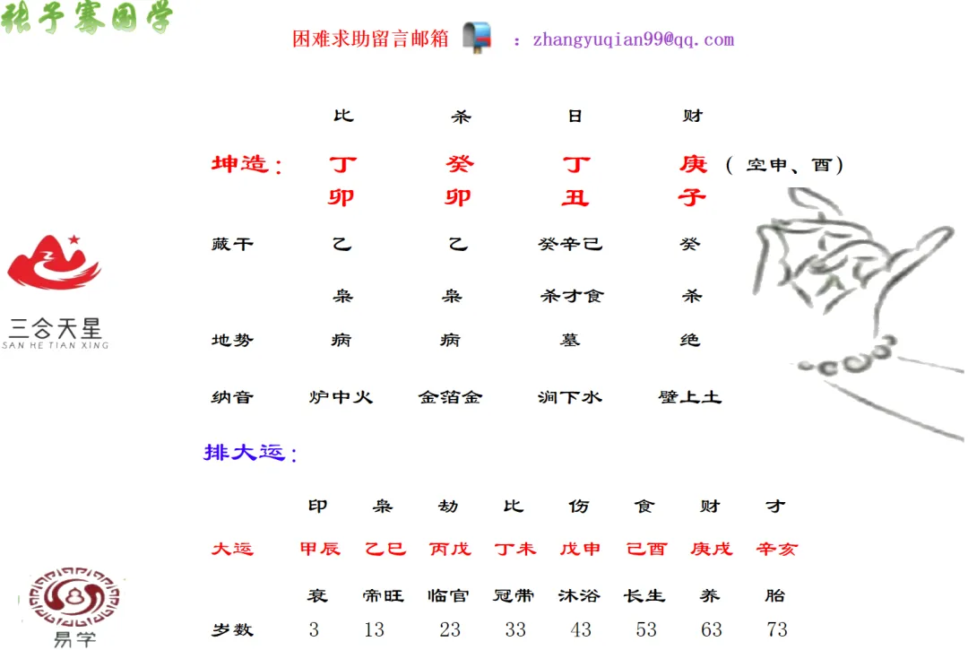 八字坤造:丁卯年、癸卯月、丁丑日、庚子时(日空:申酉)