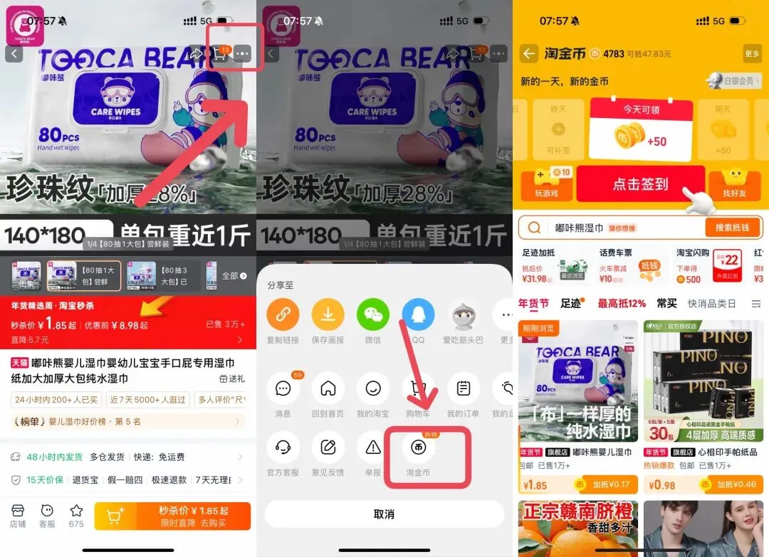 我觉得今年用的最实用最方便的就是淘金币了,淘金币也是我们每个人长期都可以薅可以用的大羊毛,我拿这个纸巾给大家举例,我们找到这个商品之后,右上角有三个点,我们直接点进去,点进去之后我们就能找到淘金币了,我们点进去下单就可以了,基本上每一单都能省一点点!这个羊毛不薅白不薅