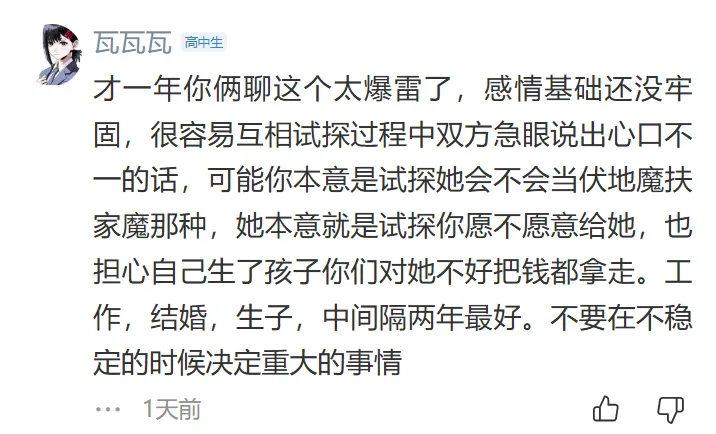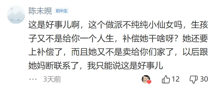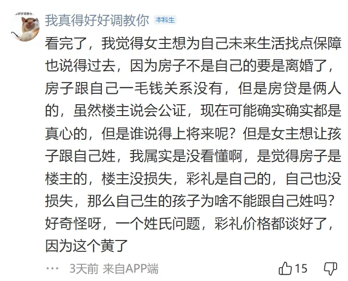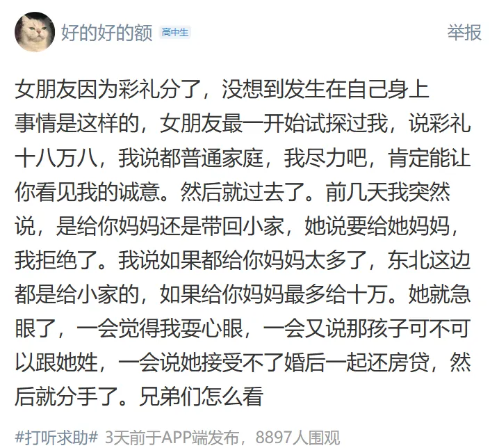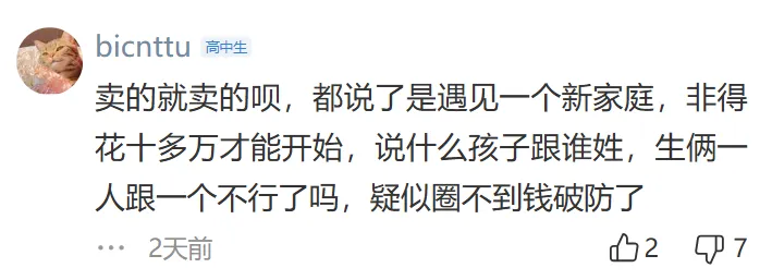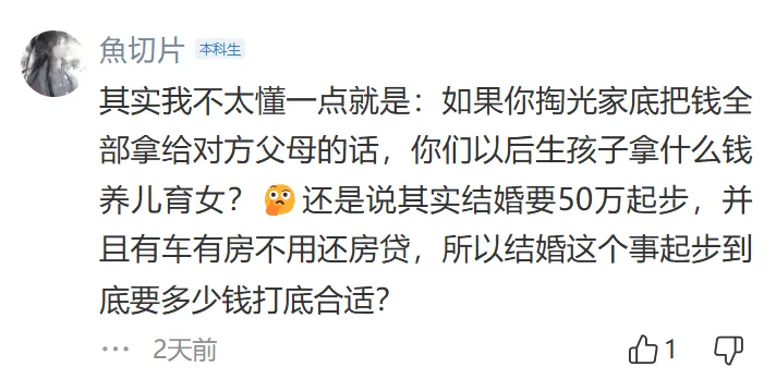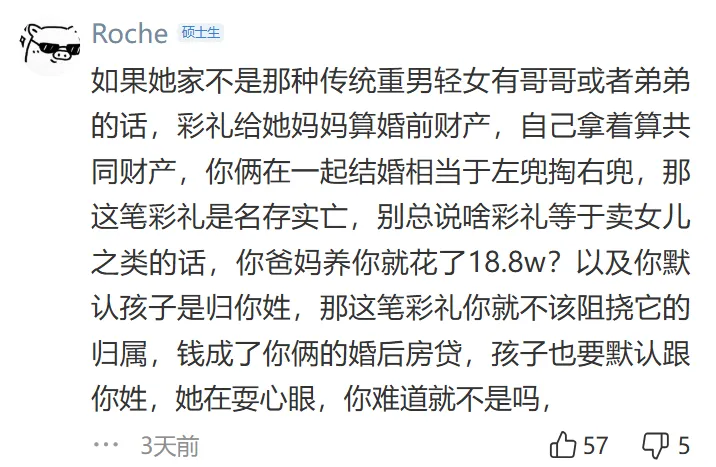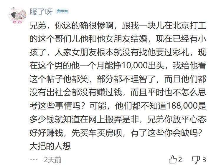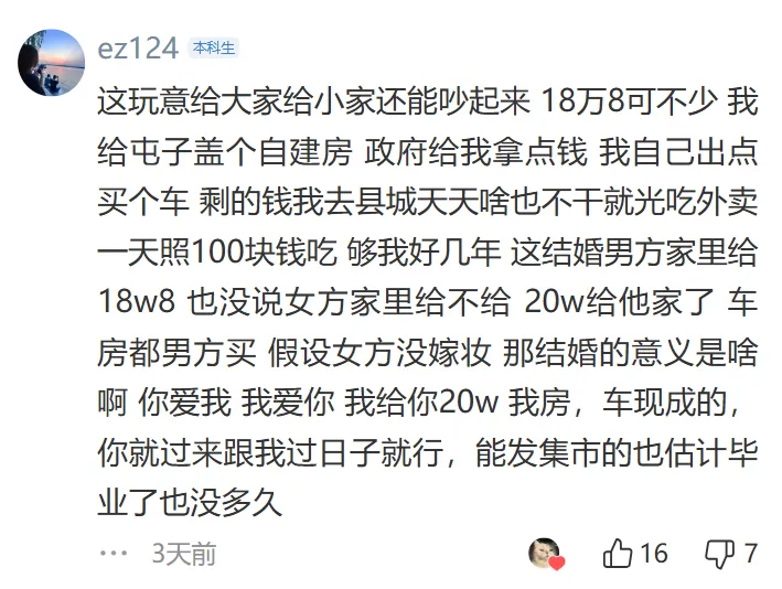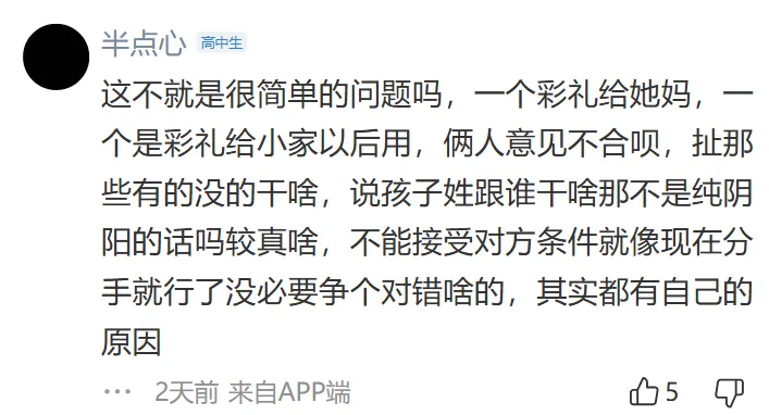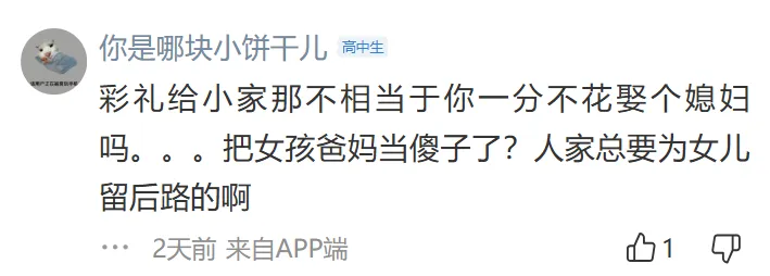 彩礼金额过高,普通人负担不起,而且女方家庭无法提供等额的助力。彩礼应该作为小家的启动资金,而不是给女方父母,这有“卖女儿”的嫌疑,认为彩礼是男方适当表达诚意的方式,而不是被提款来赡养女方父母。并且认为在婚前能够认清女方家庭这一点是能够及时止损的。