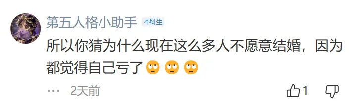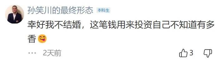 彩礼就要花小20万,婚后开销、养娃费用、房贷甚至车贷的费用也不少,结婚就是花钱无底洞,而且涉及到花钱就有觉得自己亏的地方。没有这么多钱不如不结婚,把自己的钱投资自己美滋滋。