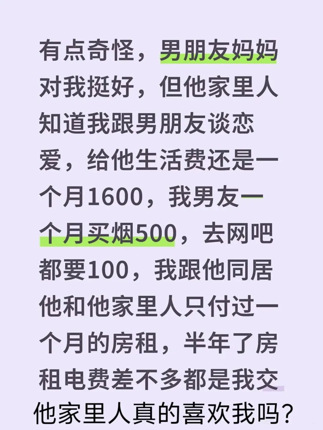 男生妈妈当然喜欢你呀,谁不喜欢帮自己养儿子的人呢?有人照顾她儿子,出钱又出力的,她有啥不喜欢的,反正受益的是她儿子,在她看来你就是爱她儿子爱的要死。