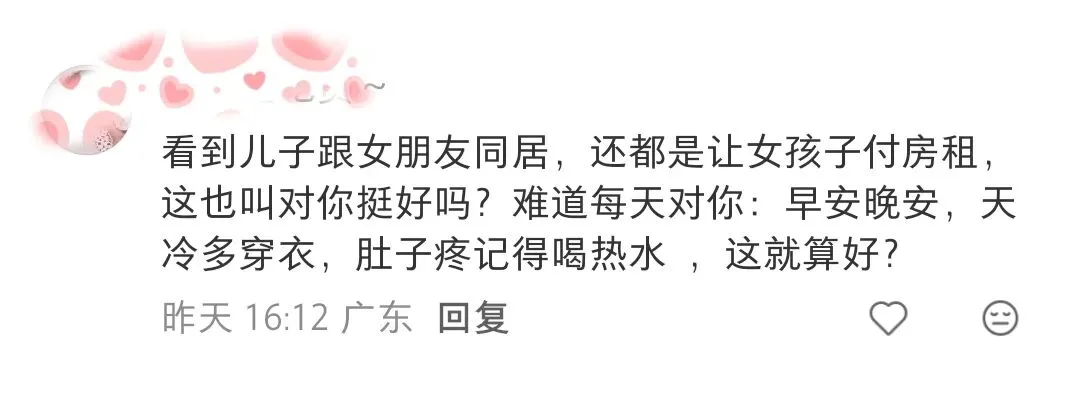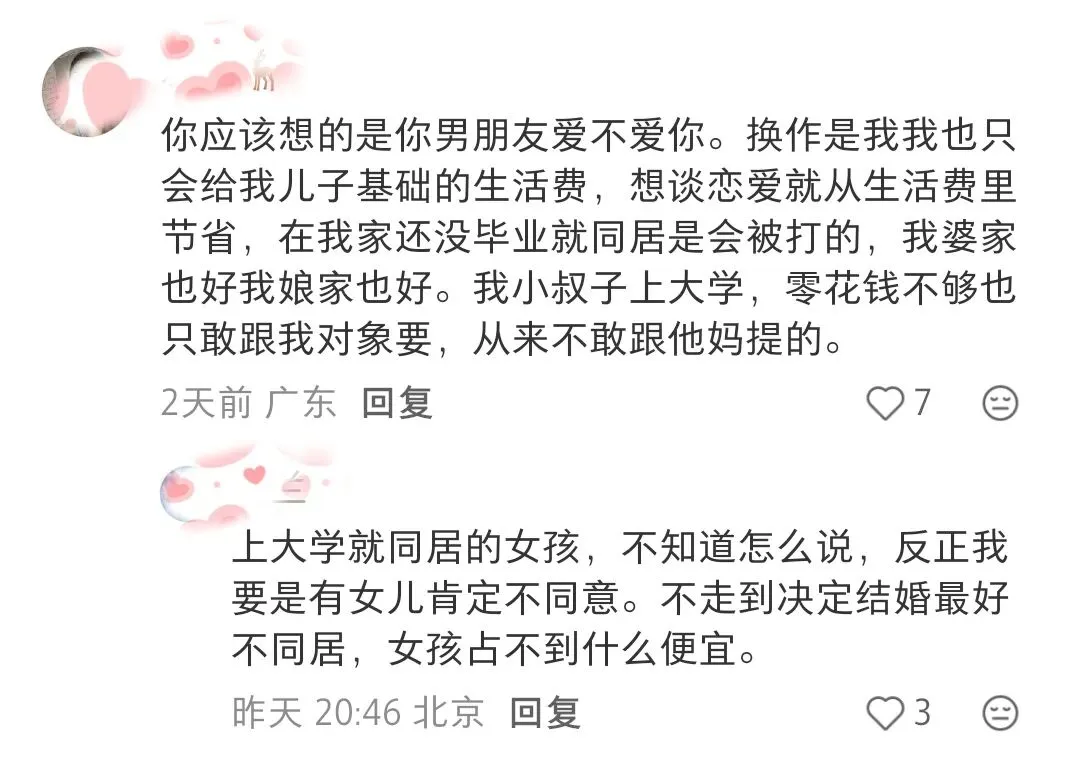 这样的女孩太随便了,太不自爱了,现在反正是占便宜儿子也不亏,但是以后如果结婚成为我家儿媳妇,那就得考虑考虑了,可不能当冤大头。