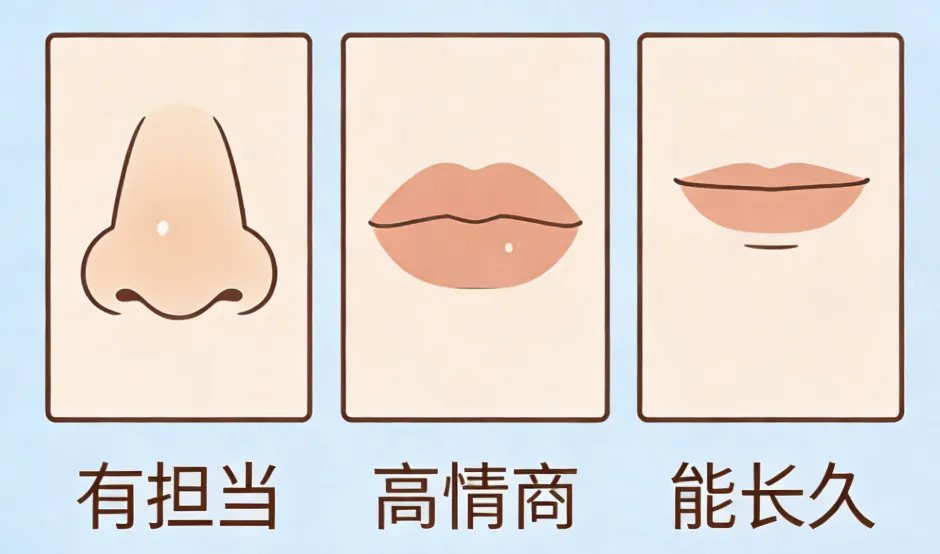 鼻子是脸部的支柱,也是“五岳中的中岳”,材料里说鼻子是“财星”,但在婚恋里,鼻子更能看出男生的担当和理财能力——毕竟婚姻离不开柴米油盐,靠谱的担当和合理的理财,才是安稳日子的基础。✅ 值得选的面相:鼻梁山根不断、年寿部位滋润,鼻梁端正高挺,准头圆而且有肉,左右兰台、廷尉部位圆正。这样的男生,做事有魄力、有担当,遇到问题不推诿、不逃避,能主动扛起责任;准头有肉、鼻孔丰满厚实,说明他会理财、能存钱,不会乱花钱,能给你安稳的物质保障,而且为人忠正、治家有方。❌ 要避开的面相:鼻梁塌陷、山根低陷,或是准头尖细弯曲、鼻孔上翻露孔。这样的男生,胸无大志、遇事逃避,没有担当,遇到困难只会甩锅;准头尖细的人,奸诈自私,爱耍小聪明,很难真心待你;鼻孔露孔的人,花钱大手大脚,不会理财,晚年容易孤单,也难给你安稳的日子。补充:南方男生只要鼻梁不露骨,就是好相,不用过分追求高挺,端正有肉就好。五、嘴巴:看情商,懂相处