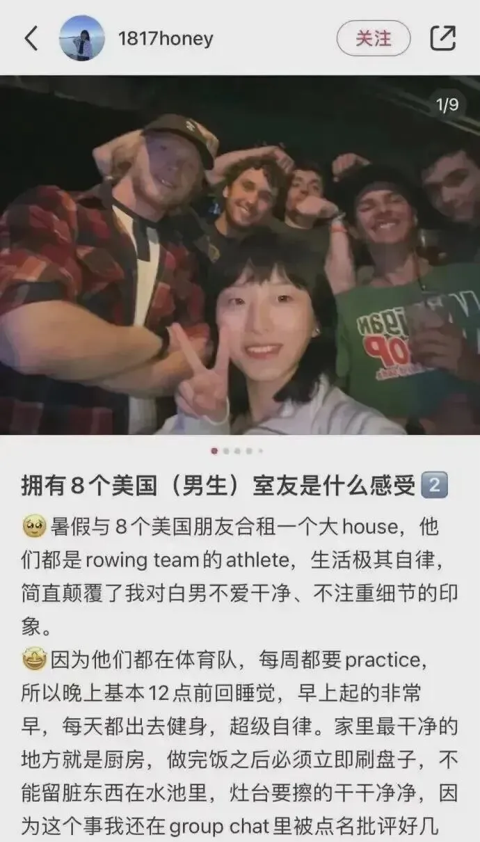 还有女留学生在小红书高调炫耀,自己同时伺候8个美国男室友,还觉得这是“高人一等”的荣耀,字里行间满是病态的优越感。